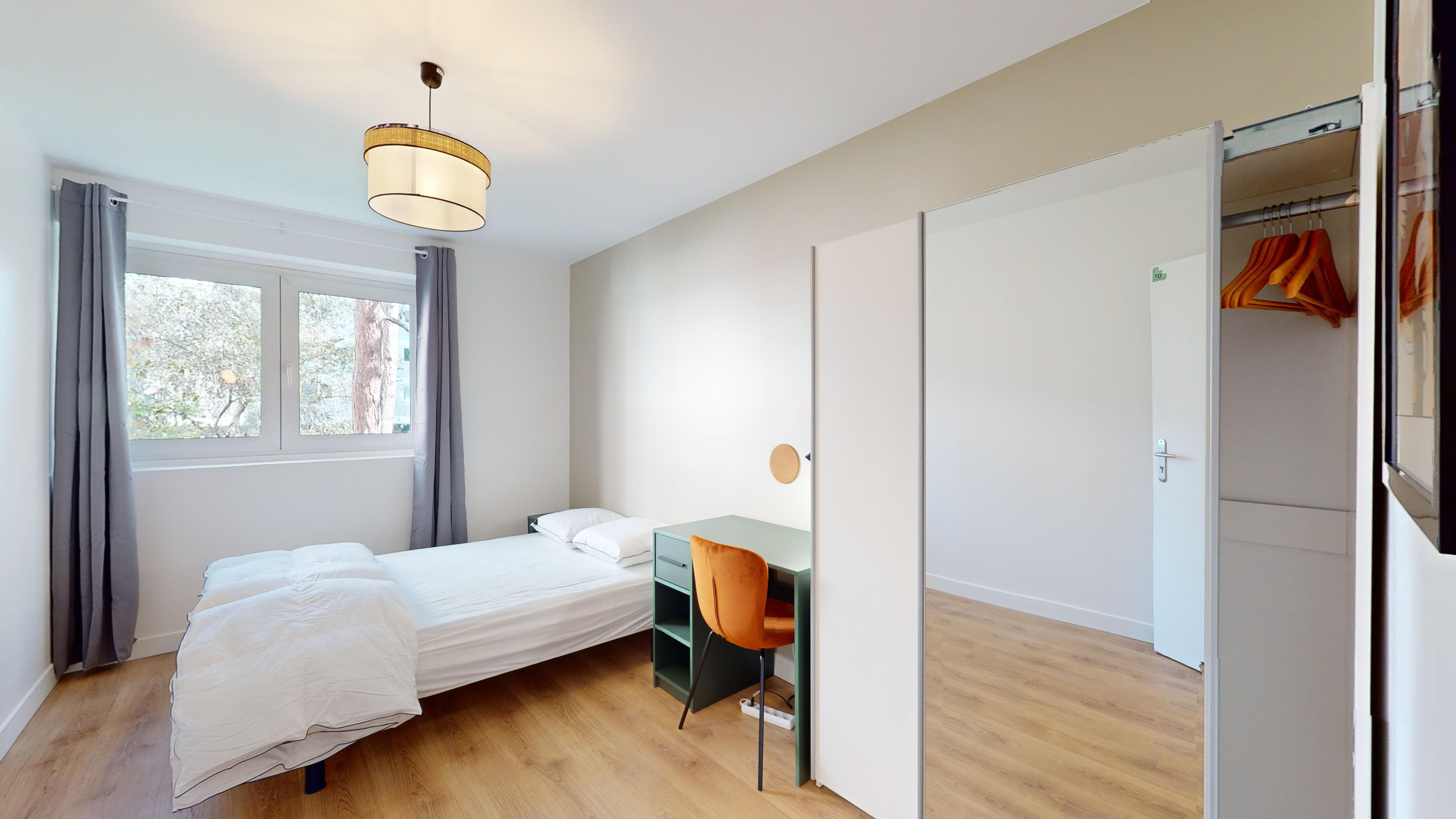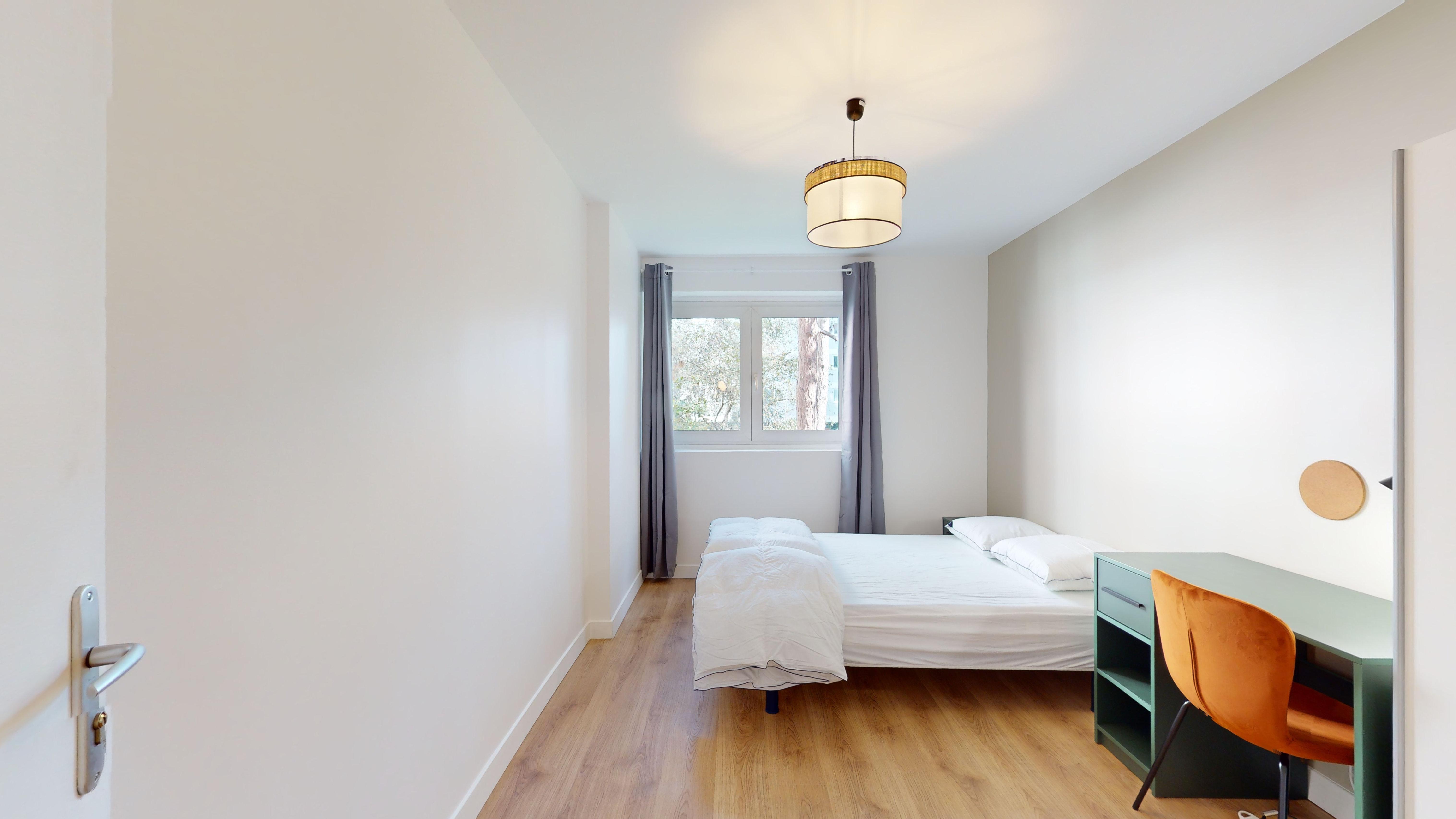 La chambre Room 7, d'une superficie de 12 m², est spécialement conçue pour une personne. Elle est meublée d'un lit double confortable, d'une armoire pour vos affaires, d'un bureau et d'une chaise pour travailler ou étudier. La chambre bénéficie aussi d'une connexion internet haut débit et partage une salle de bain moderne avec d'autres locataires.