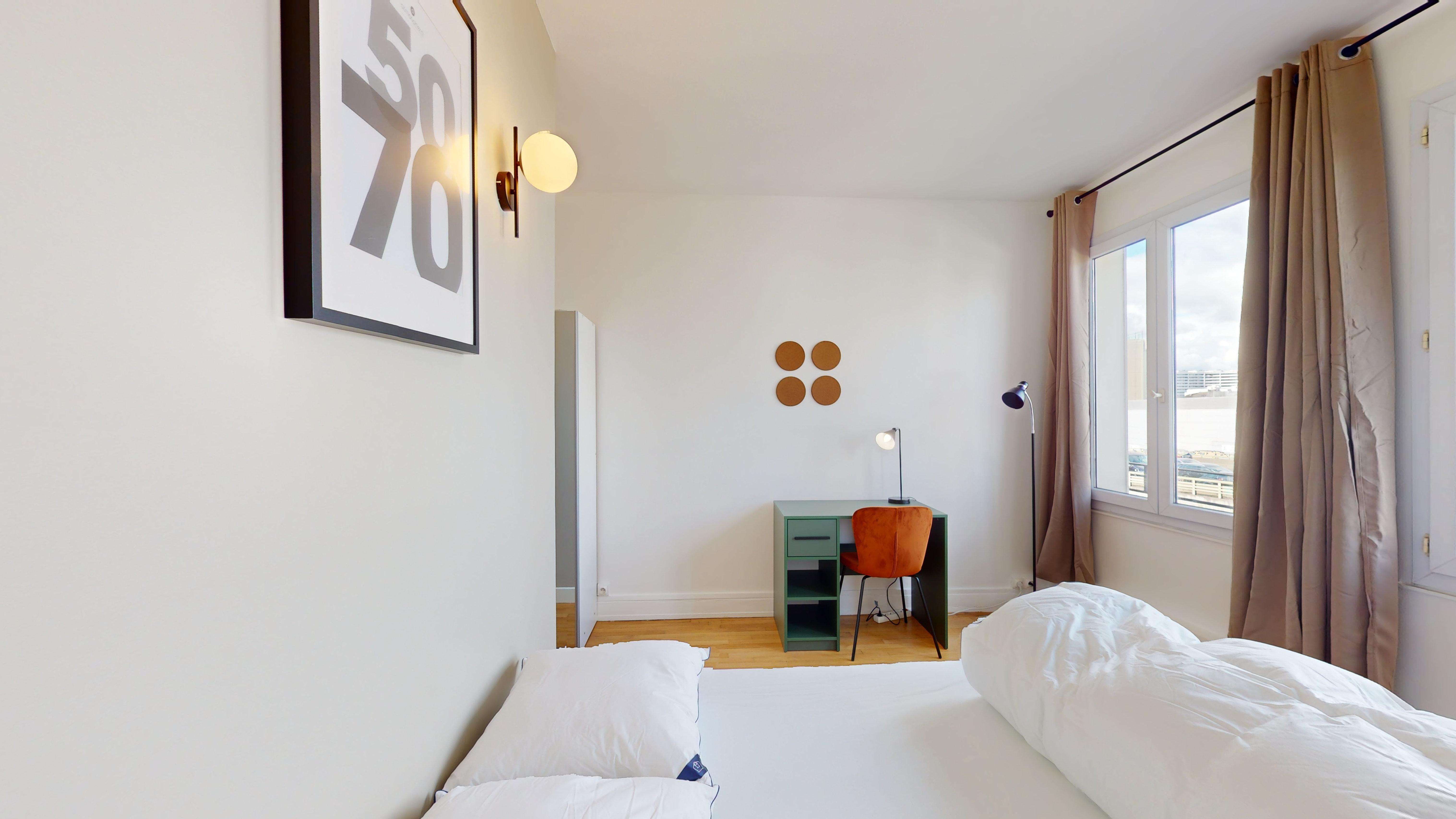 Votre chambre est un espace confortable et bien aménagé avec un lit douillet, un bureau pour travailler et des rangements pour vos affaires. Elle dispose d'une salle de bain moderne rien que pour vous.