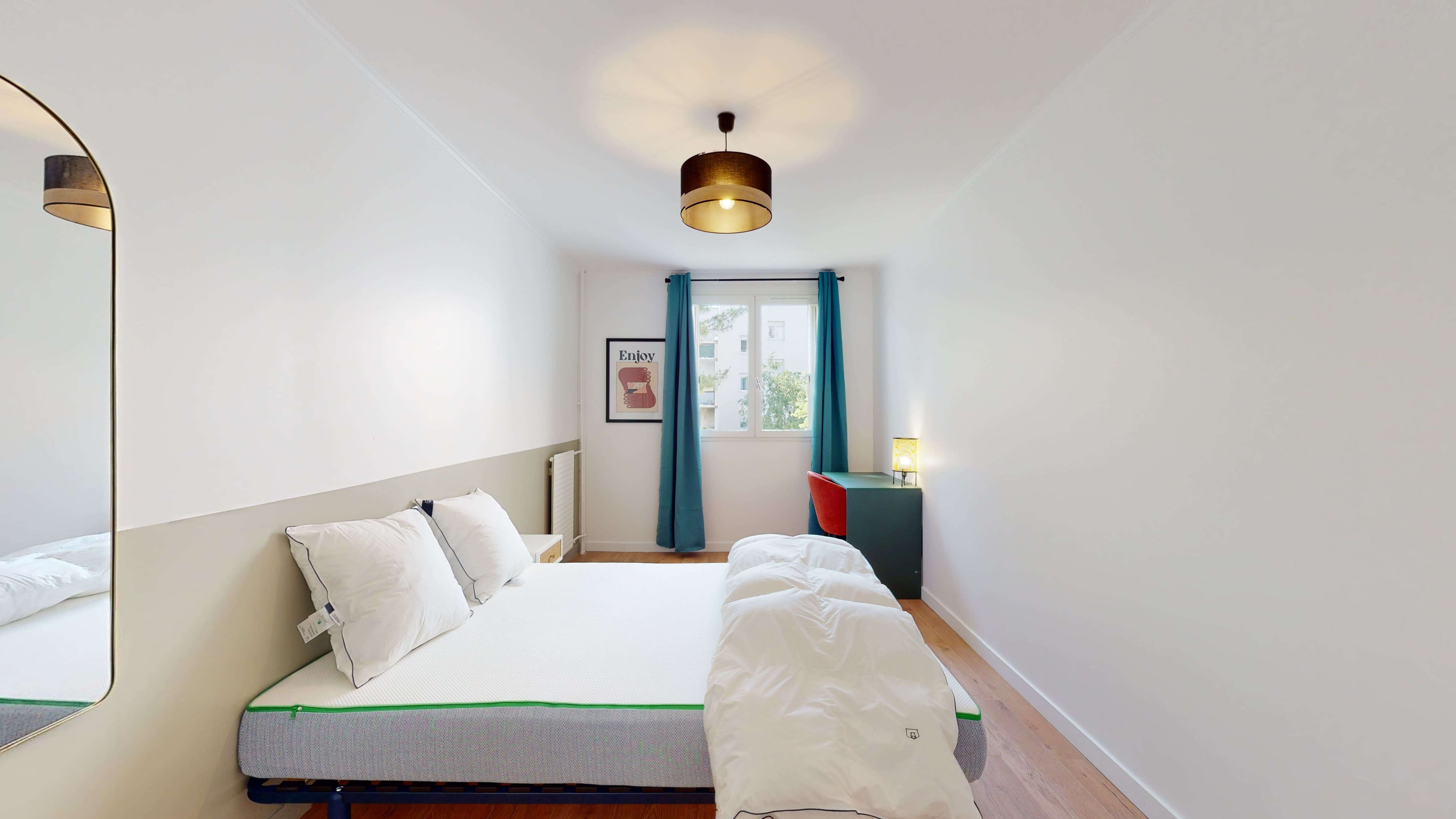 La chambre, nommée Room 2, est conçue pour une personne. Elle est douillette avec un lit double et une literie de qualité, une armoire pour vos affaires, un bureau pour travailler et une chaise. La chambre de 11 m² partage une salle de bain moderne avec d'autres locataires. Elle est équipée d'internet haut débit et d'autres commodités pour votre confort.