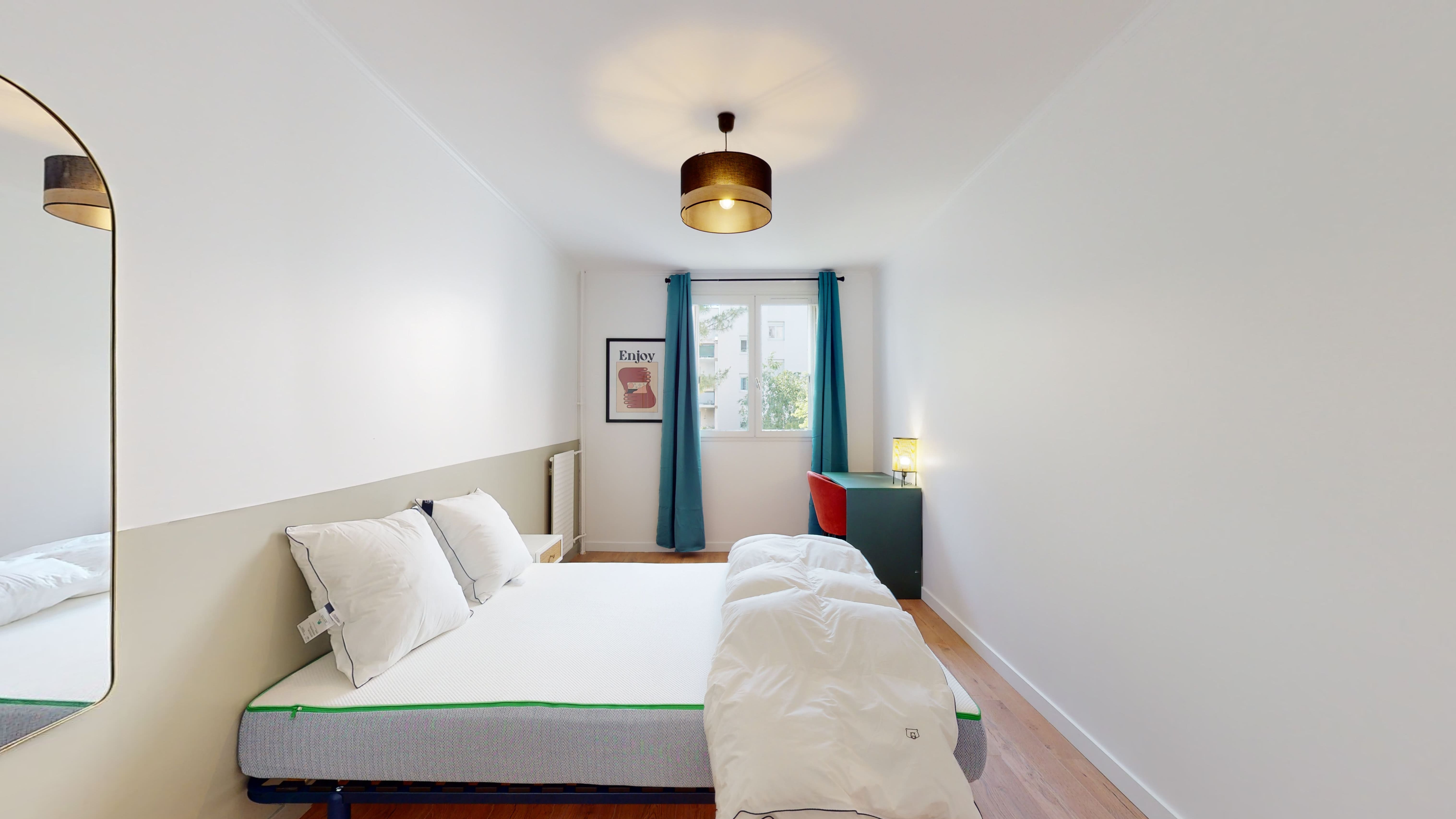 La chambre, conçue pour une personne, est un espace douillet de 10 m². Elle dispose d'un confortable lit double, d'une armoire pour vos affaires, d'un bureau pour travailler et d'une chaise. La chambre partage une salle de bain moderne avec douche et toilettes.