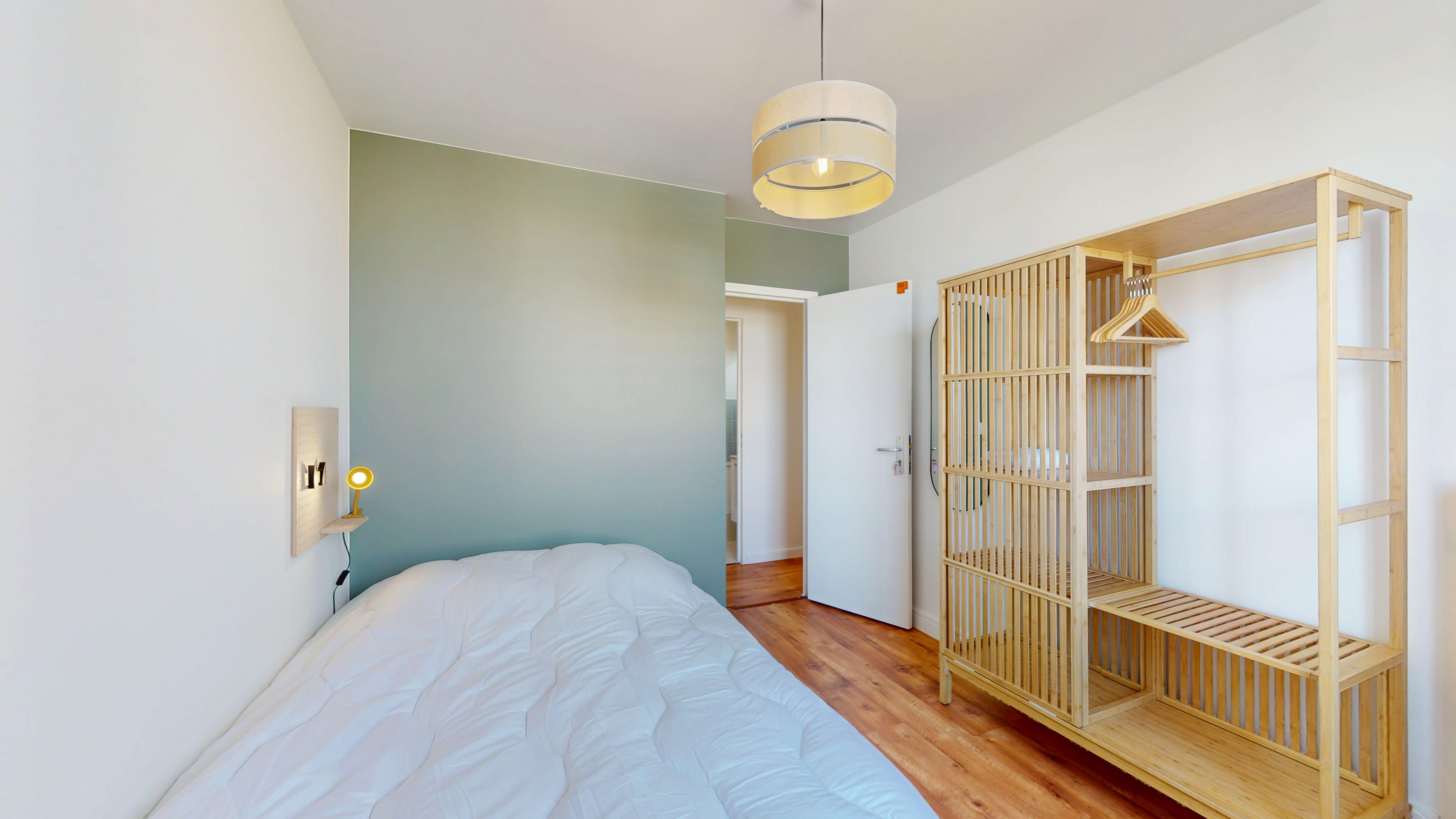 La chambre 3 est votre espace personnel de 9m2 où vous pouvez vous reposer et étudier. Elle est meublée d'un lit double confortable avec de la literie de qualité, d'une armoire pour vos vêtements, d'un bureau et d'une chaise pour travailler, ainsi que d'une connexion internet haut débit. La chambre dispose également d'un radiateur pour rester au chaud et d'une poubelle pour garder votre espace propre.