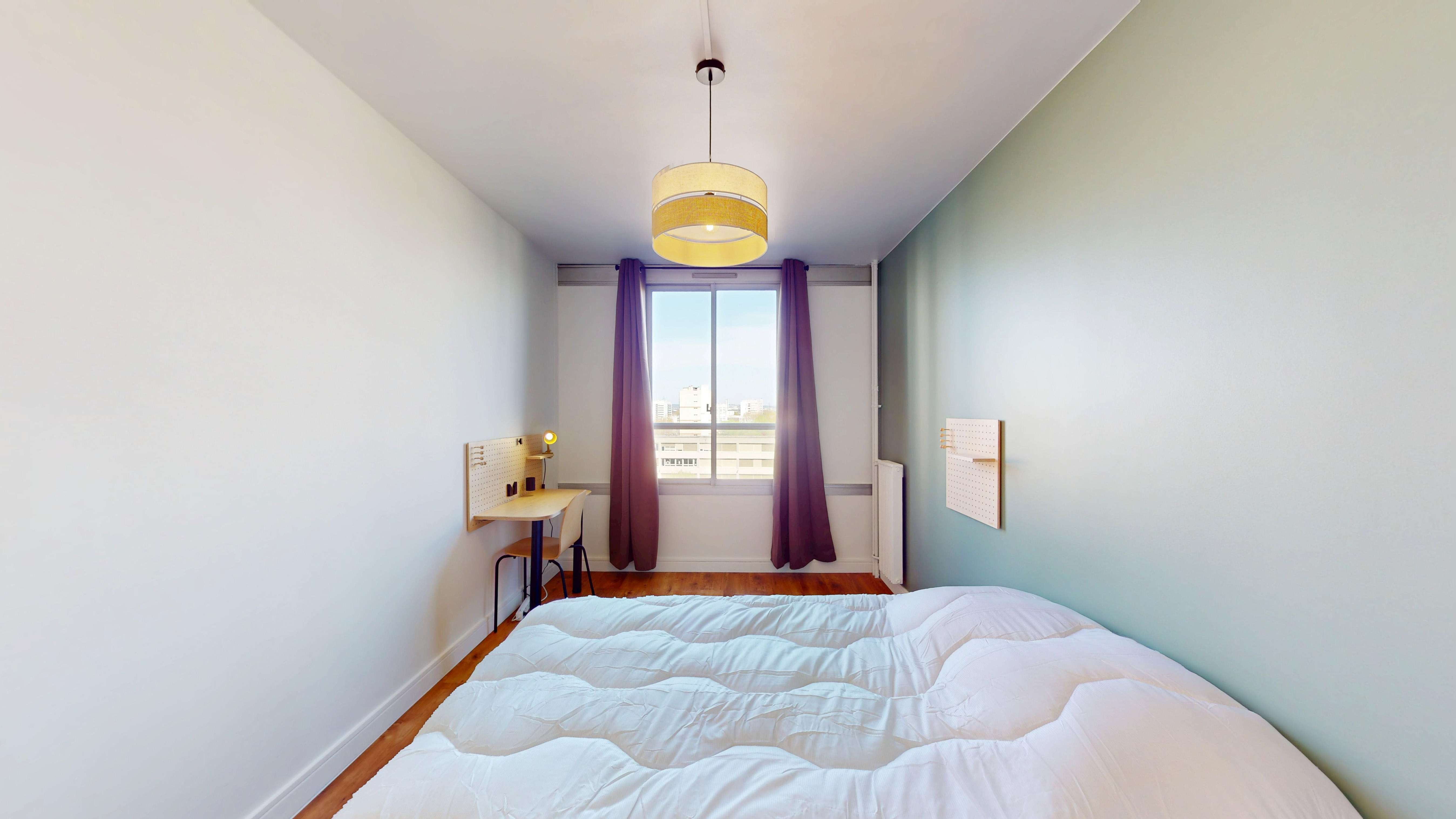 La chambre "Room 5" est un espace douillet de 11m2 avec un lit double confortable et une literie de qualité pour bien dormir. Elle est équipée d'un bureau pour travailler ou étudier, d'une lampe de bureau, d'un placard pour ranger vos affaires, et d'une connexion internet haut débit. La chambre a aussi des rideaux pour votre intimité et un radiateur pour rester au chaud.
