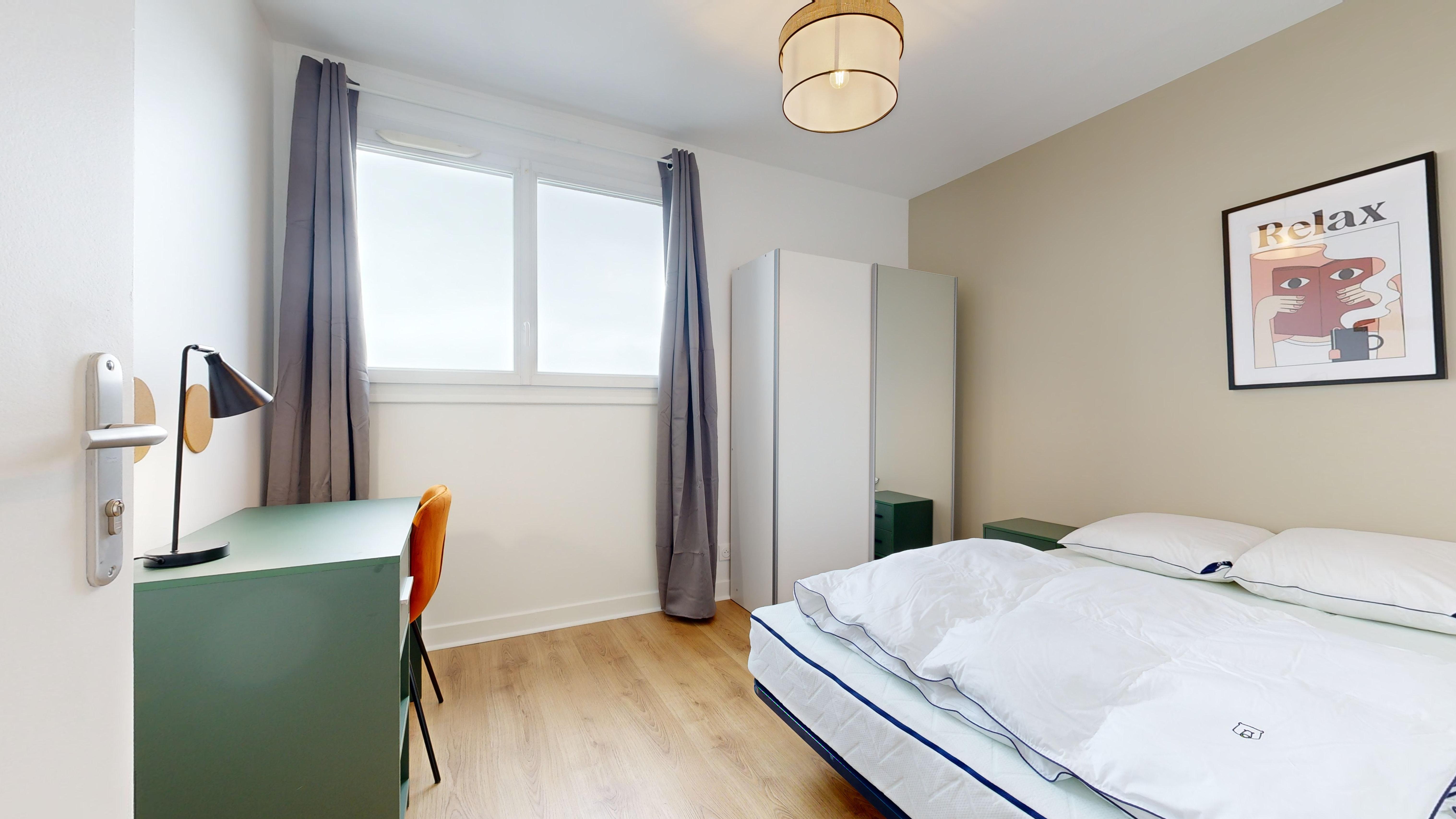 Votre chambre privée est un havre de paix avec tout le nécessaire : un lit confortable, un bureau pour travailler et des rangements pour vos affaires. La salle de bain attenante est moderne et pratique avec une douche à l'italienne.