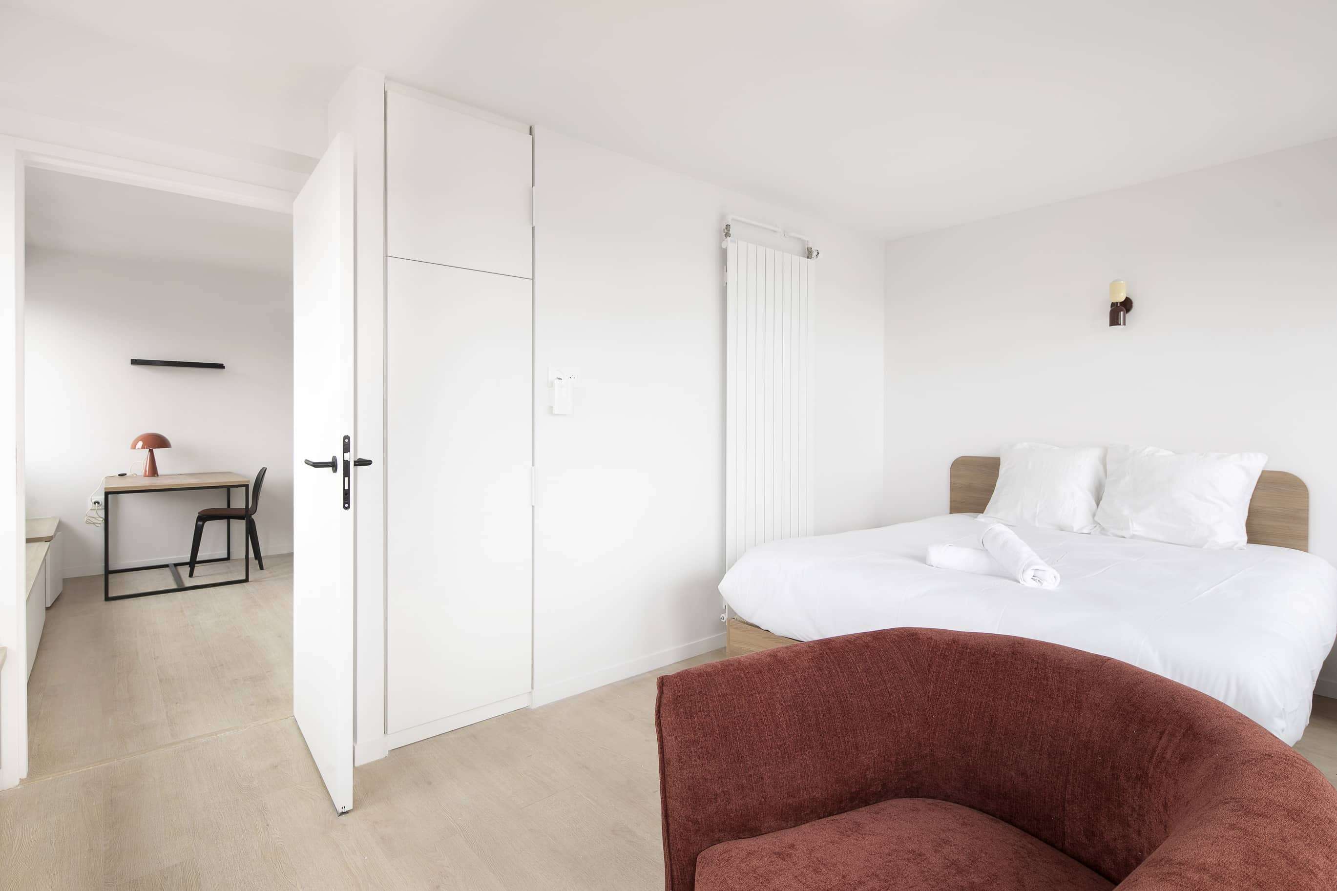 La chambre One-bedroom Flat (T2) - 810, située au huitième étage, est un espace privé et bien agencé de 32m2. Elle est conçue pour accueillir confortablement deux personnes avec un lit double douillet, une armoire spacieuse pour vos affaires, un bureau pratique et une chaise pour travailler ou étudier. La salle de bain privative est équipée d'une douche moderne, d'un lavabo et de toilettes. Vous bénéficiez également d'une kitchenette personnelle, tandis que les plaques de cuisson sont partagées dans la Home avec d'autres résidents.