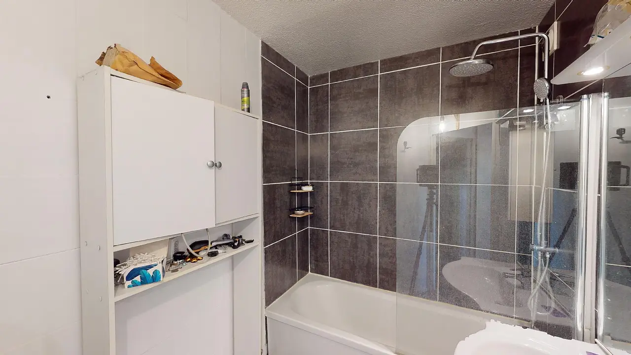 Une première salle de bain pour les deux chambres trouve au 1er étage : baignoire, meuble vasque ainsi que placard de rangement.