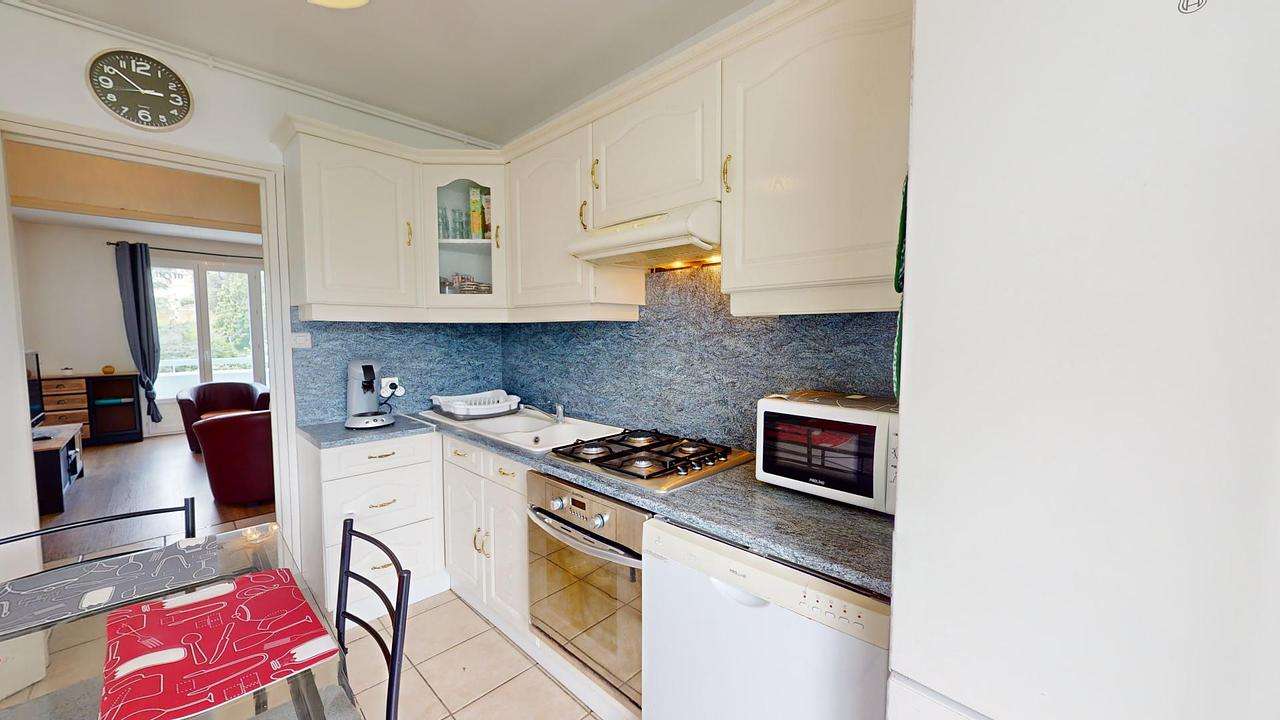 La cuisine est équipée d'un réfrigérateur avec congélateur, d'un four, d'un lave-vaisselle, d'un micro-ondes, de plaques de cuisson, d'un évier, d'une machine à café, d'une table avec 3 chaises et de rangements.