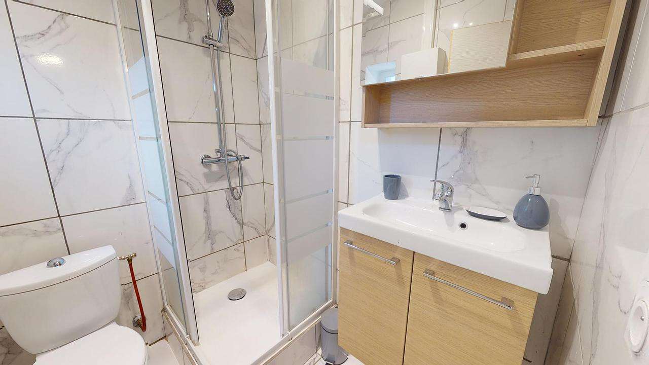 Une première salle d'eau avec une douche, un meuble vasque avec miroir et des toilettes.