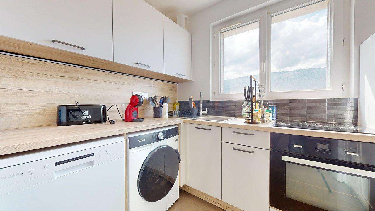 La cuisine est équipée d'un réfrigérateur, d'un four, de plaques de cuisson, d'un évier, d'une machine à laver, d'un lave-vaisselle, de nombreux rangements ainsi que d'un mange-debout avec trois tabourets.