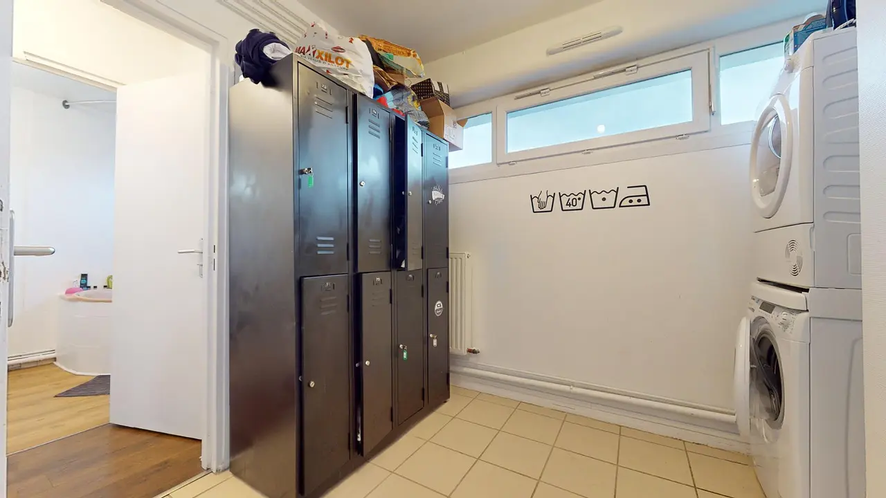 En plus de ceux disponibles dans les chambres, les locataires disposent de nombreux rangements dans les espaces communs (casiers individuels dans la cuisine, casiers de vestiaires dans la buanderie).