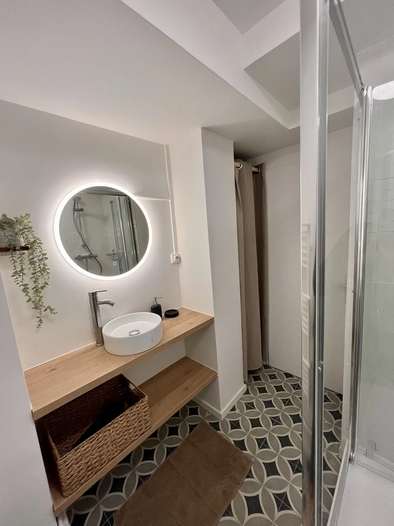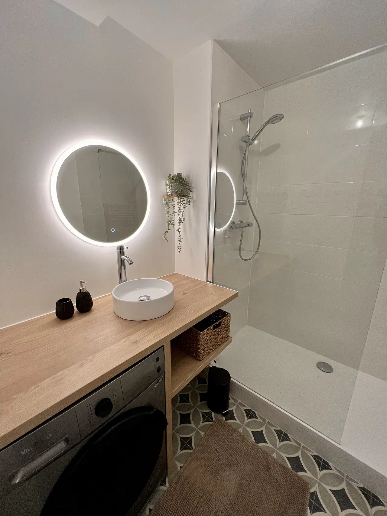 L’appartement comprend deux salles de bain : l’une avec douche, meuble vasque, miroir LED, sèche-serviettes et rangements ; l’autre avec douche à l’italienne, meuble vasque, miroir LED, étagères et machine à laver. Un WC séparé est également disponible.