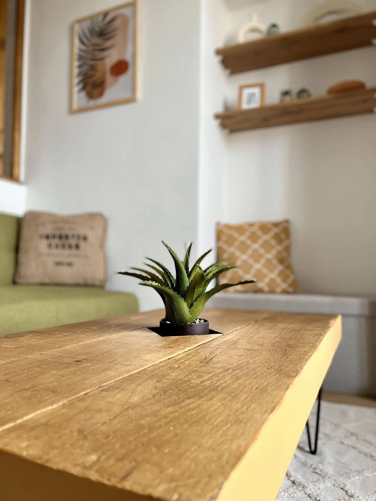 Dès l’entrée, vous accédez directement à la pièce de vie et à la cuisine. L’entrée est équipée d’un meuble à casiers pour les chaussures et d’un claustra décoratif qui sépare joliment les espaces.