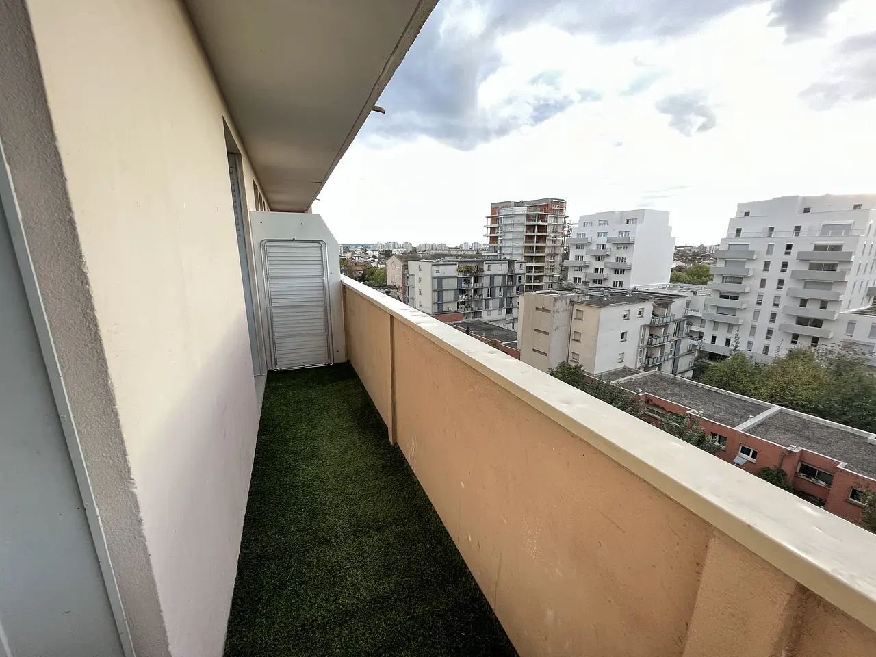 Depuis la pièce de vie et la cuisine, grâce à deux portes-fenêtres, vous avez accès à un balcon commun. Ce balcon est recouvert de faux gazon, offre une vue dégagée sans vis-à-vis, et constitue un espace extérieur très agréable.