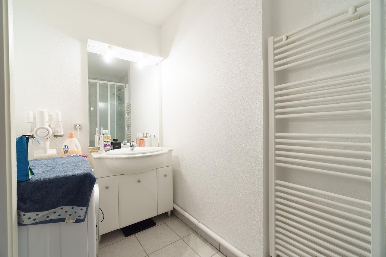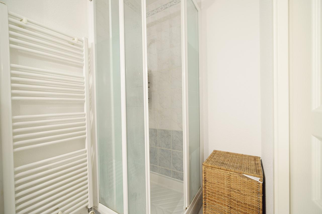 La salle d'eau dispose d'une cabine de douche, d'un meuble vasque et d'un sèche-serviette.