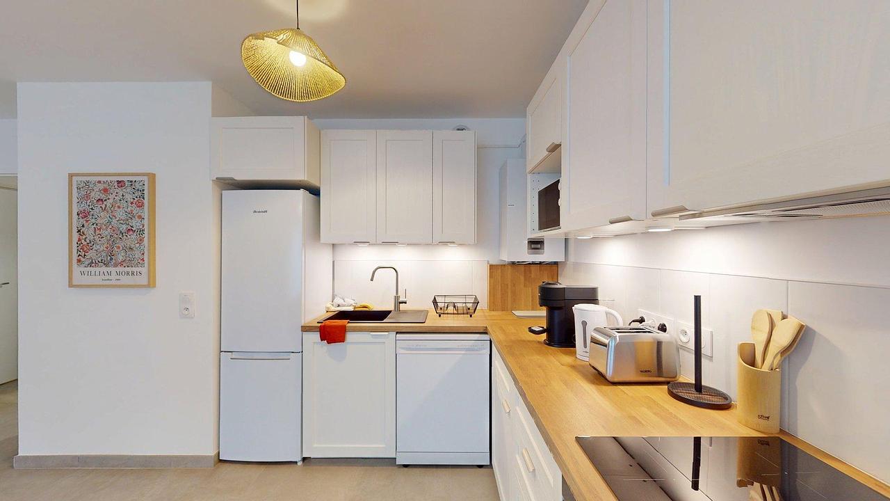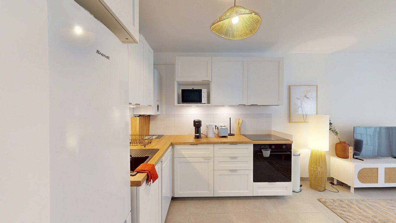 Ouverte sur le séjour, la cuisine a été pensée pour allier confort et fonctionnalité. Entièrement équipée, elle dispose d’un four, d’un micro-ondes, de plaques de cuisson, d’une hotte, d’un évier, d’un réfrigérateur avec compartiment congélateur et d’un lave-vaisselle. De nombreux rangements ainsi que des ustensiles de cuisine sont mis à disposition.