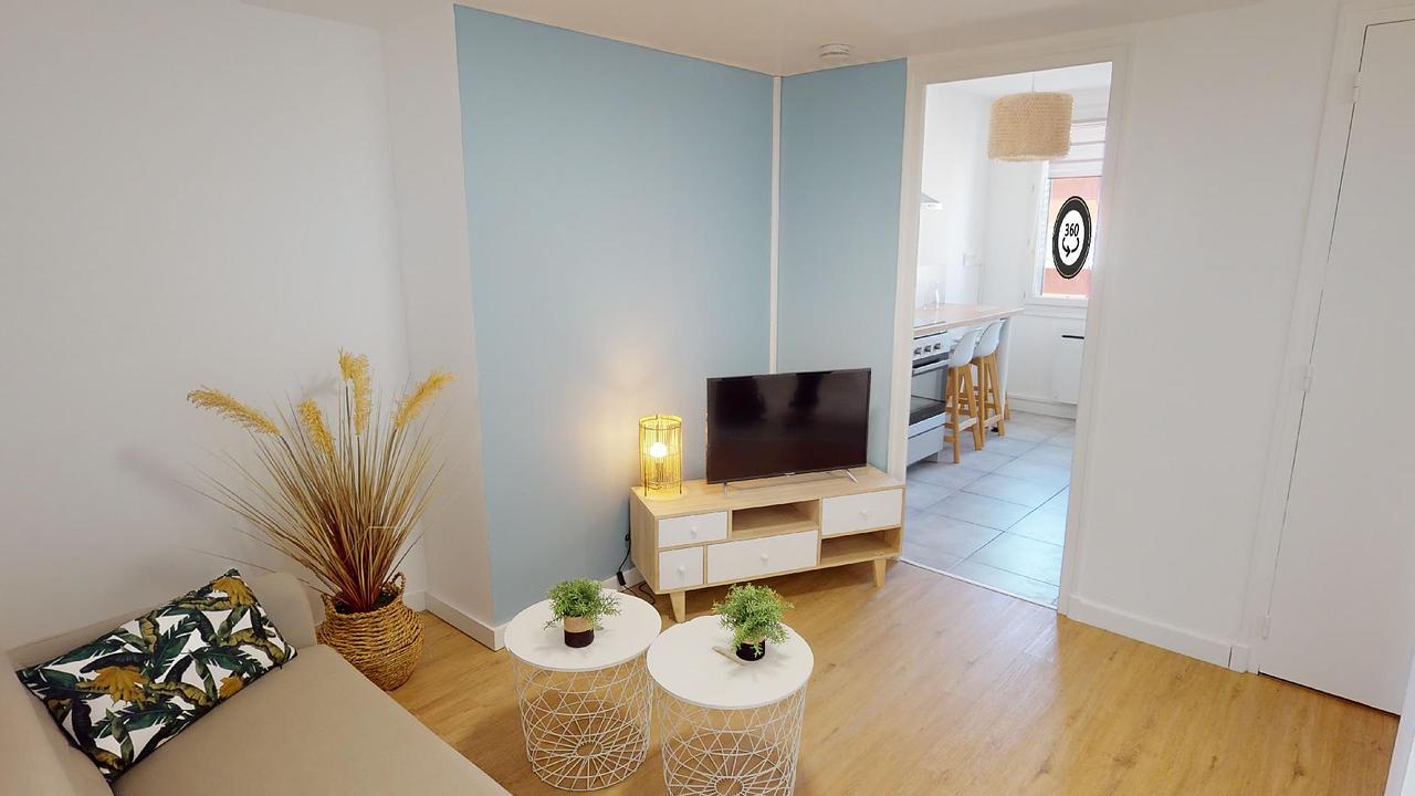 La colocation comporte un salon avec canapé, table basse, TV et meuble TV. La cuisine fermée est quant à elle équipée avec tout le nécessaire : frigo, four, plaque de cuisson, hotte, machine à laver, coin de table et de nombreux rangements.
