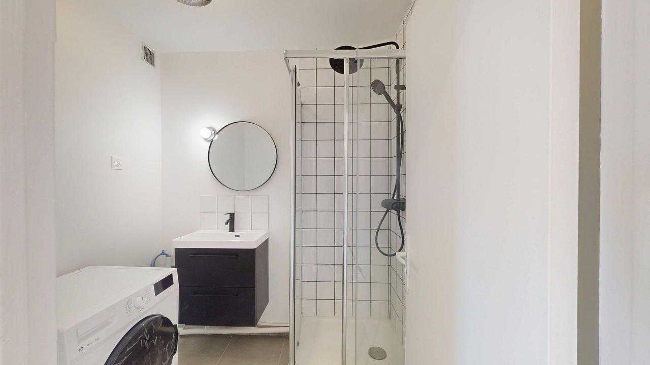 La première salle d'eau comporte une douche, un meuble vasque avec miroir, machine à laver ainsi que des rangements.