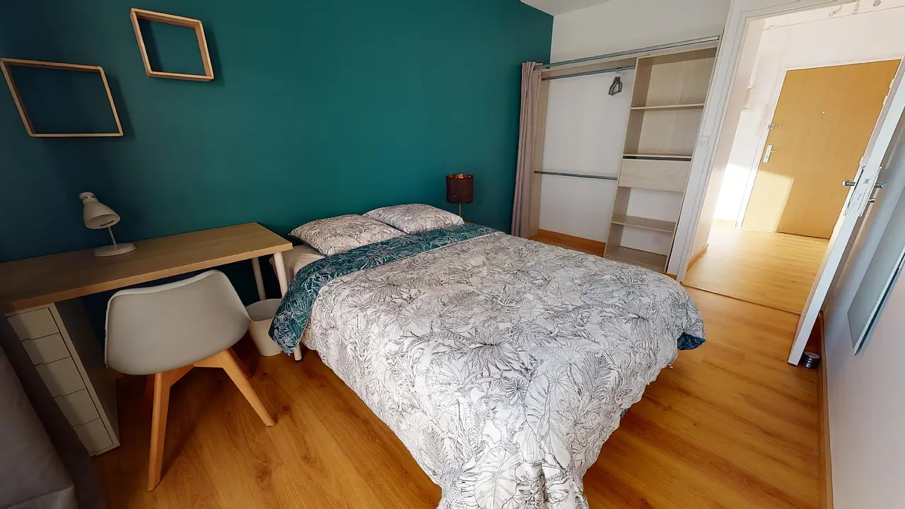 lit double, bureau, chaise et rangements (penderie et étagères)