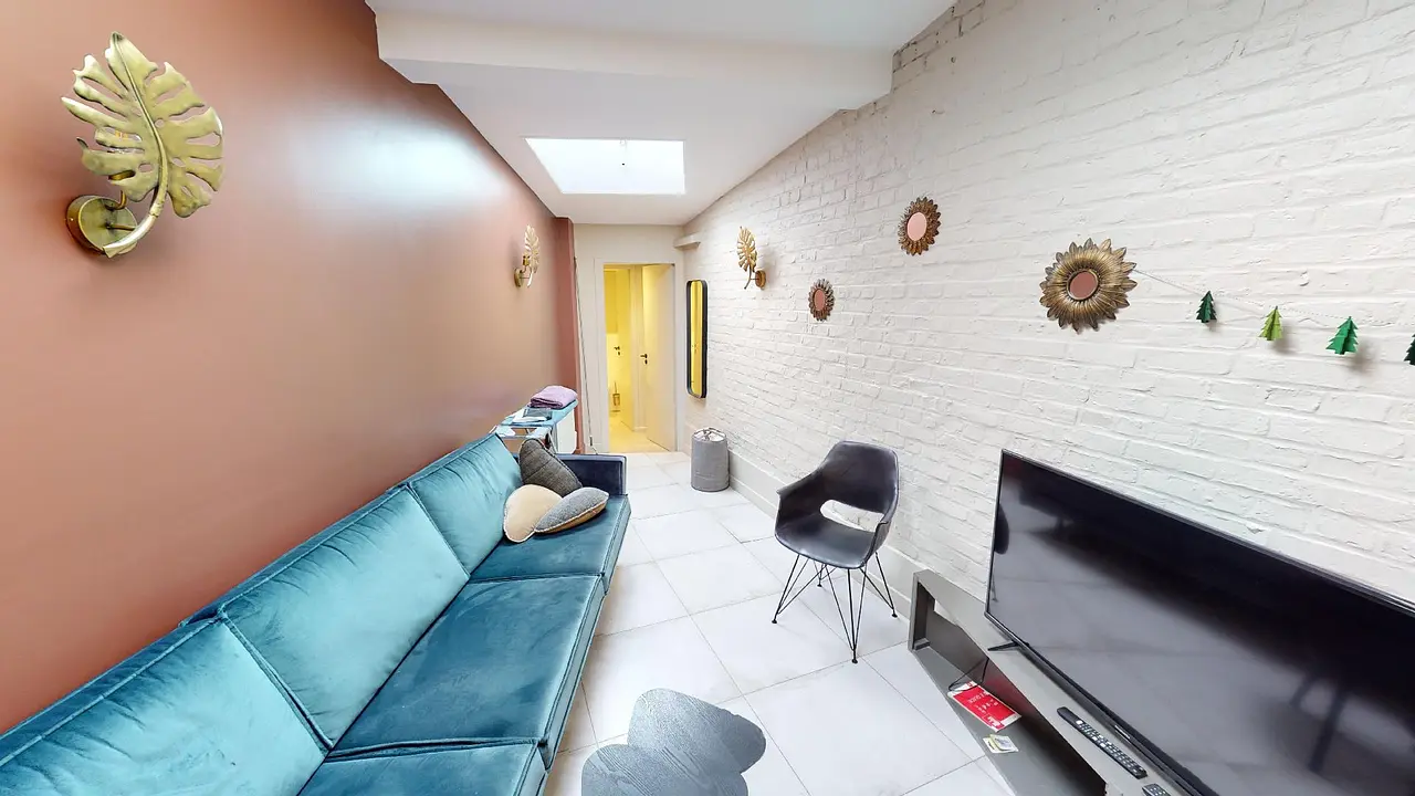 Dans la continuité de la cuisine, se trouve le salon muni de son long canapé, de plusieurs tables basses, d’un meuble TV, d’une TV ainsi que plusieurs éléments de décoration. Enfin, un espace buanderie est à la disposition de l’ensemble des locataires, équipé de sa machine à laver.