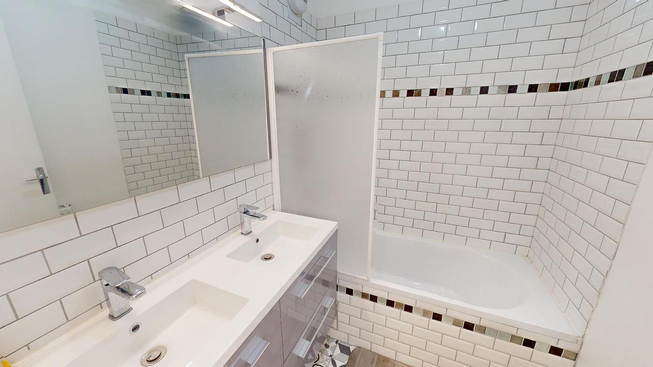 Cet appartement de 5 pièces offre un salon, une cuisine équipée (dont lave-vaisselle) et une salle de bains avec baignoire et douche.