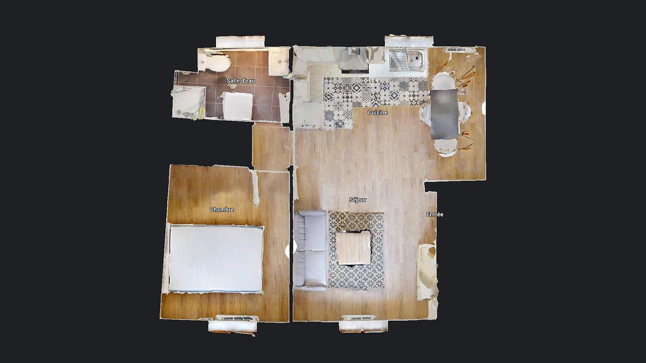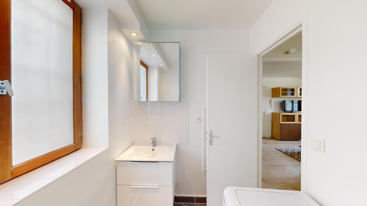 Pour compléter ce logement, une salle d'eau avec WC est équipée d'une douche, d'une machine à laver et d'un meuble vasque.