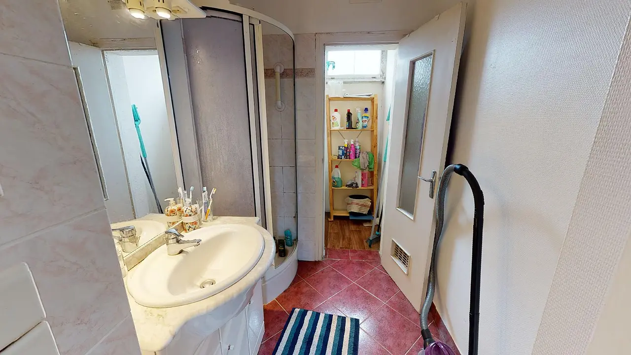 Une salle de bain avec douche et meuble vasque ainsi que des WC séparés viennent compléter ce logement. Une buanderie avec machine à laver et rangements est accessible depuis la salle de bain.