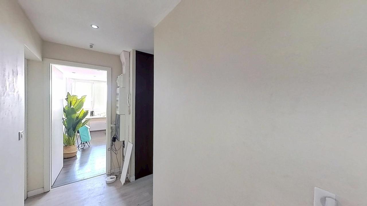 Cette colocation de trois chambres s'ouvre sur une pièce de vie aménagée d'un canapé, d'un fauteuil, de tables basses, d'un meuble TV avec une télévision ainsi que d'une table avec quatre chaises, idéal pour partager des repas entre colocataires.