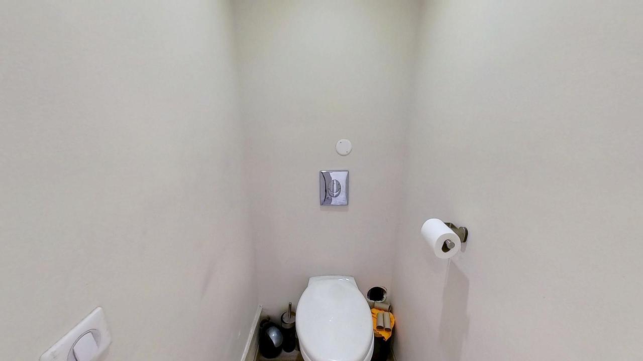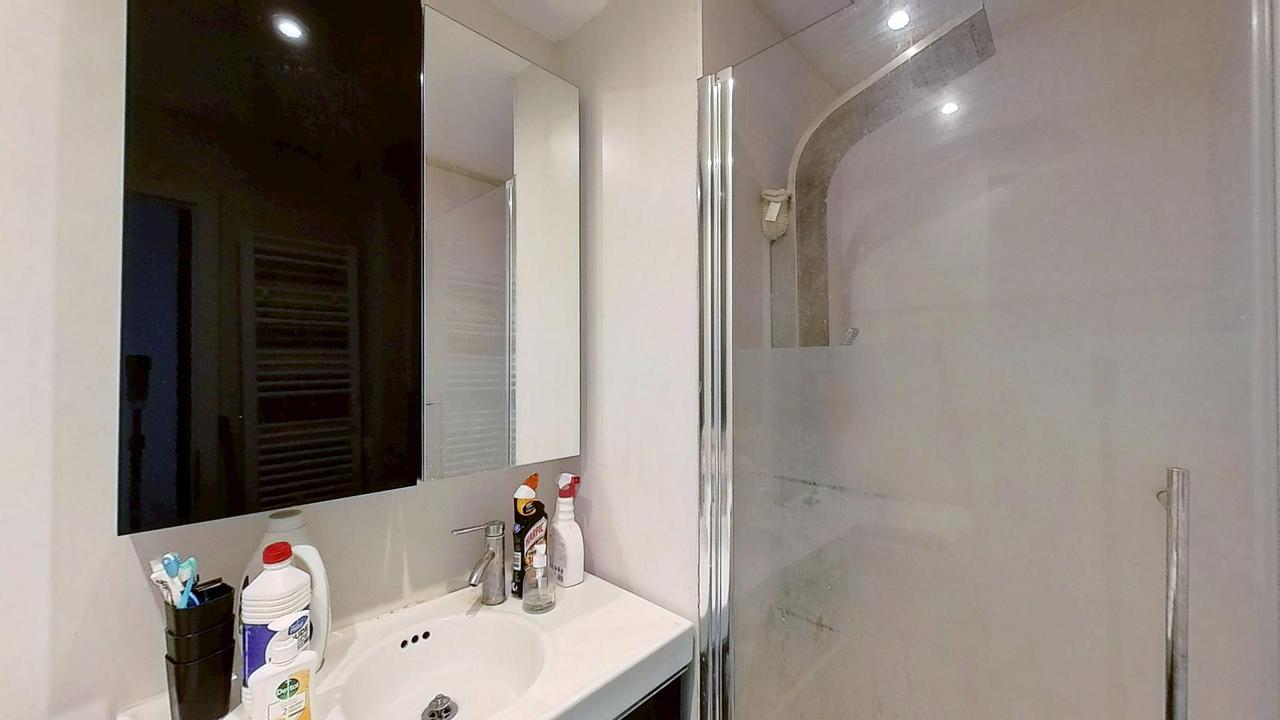La salle d'eau est meublée d'une douche, d'un meuble vasque avec miroir, d'un sèche-serviette. Une serpillère et un seau sont également mis à disposition.