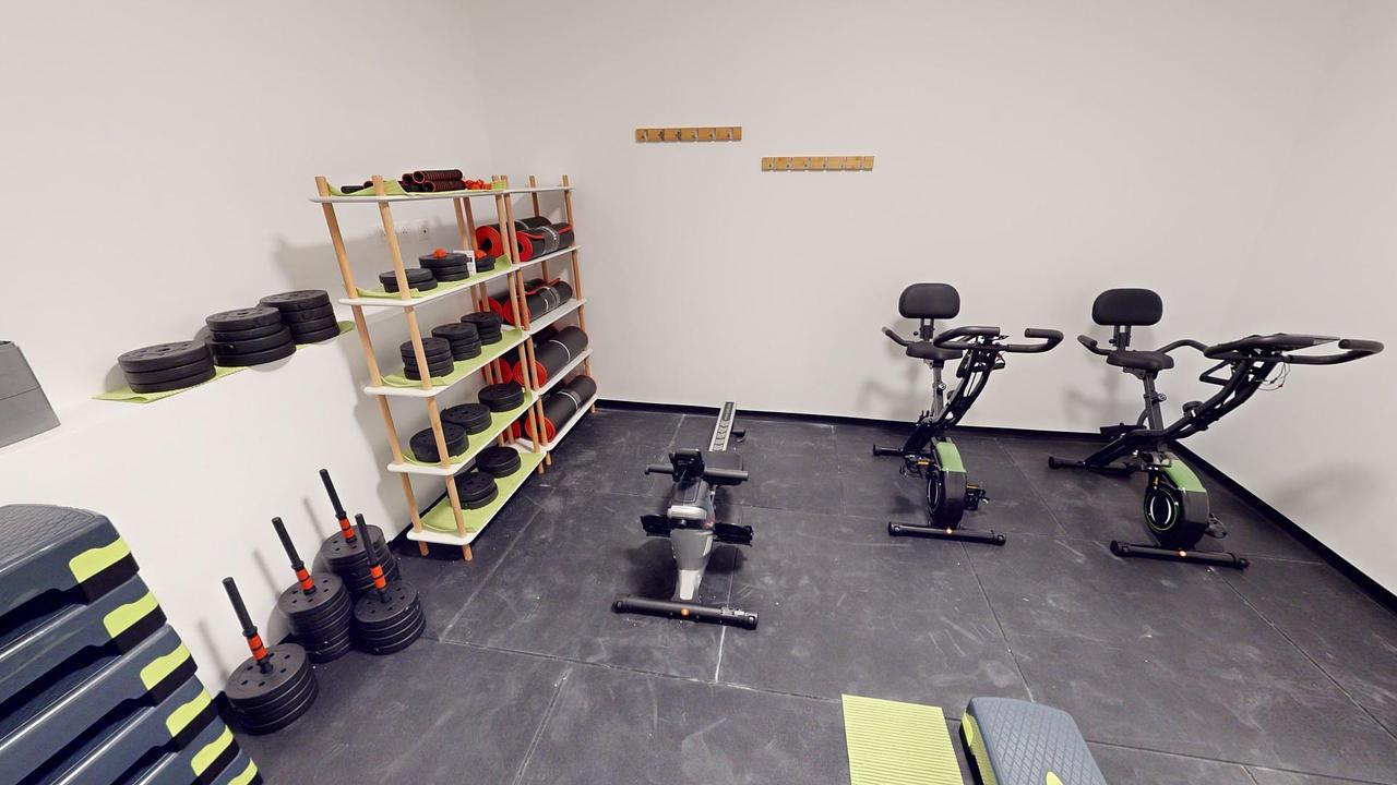Une grande salle de sport avec de nombreux poids de musculation, vélo, rameurs, step