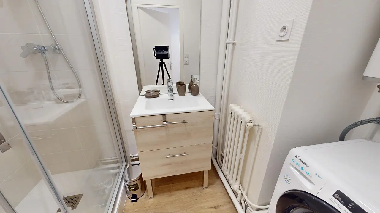 La salle d'eau dispose d'une douche, un meuble vasque avec un miroir et une machine à laver. Les toilettes sont séparées.