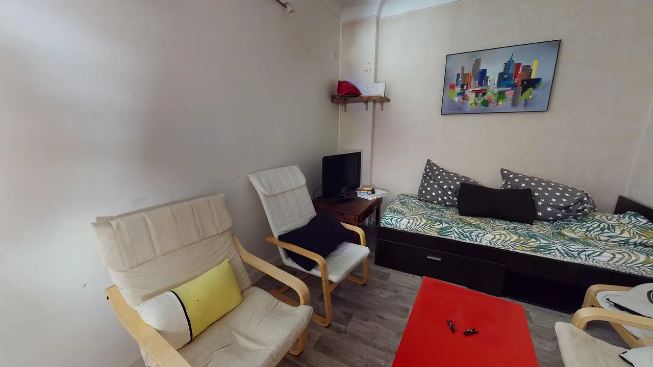 L'appartement comporte une pièce de vie pour tout les colocataires à l'entrée avec canapé et fauteuils. La salle de bain possède un meuble double vasque et une douche.