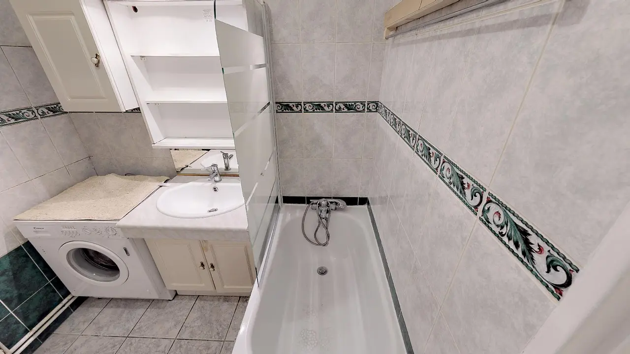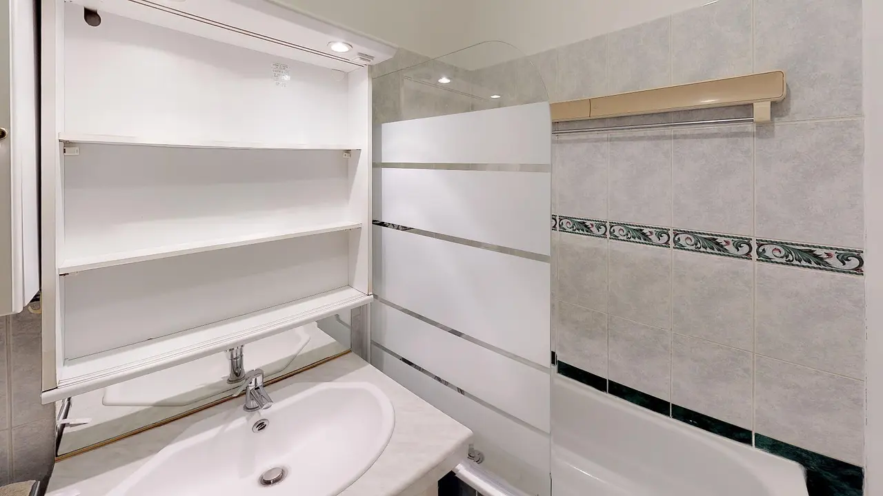 Salle de bain carrelée avec baignoire et meuble vasque