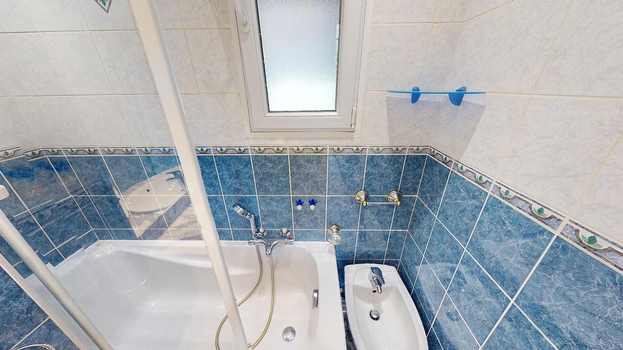 Le grand appartement s'organise comme suit : un salon avec un canapé, un fauteuil, une table à manger ainsi qu'une télévision, trois chambres, une cuisine et une salle de bains équipée d'une baignoire ainsi que d'une douche.