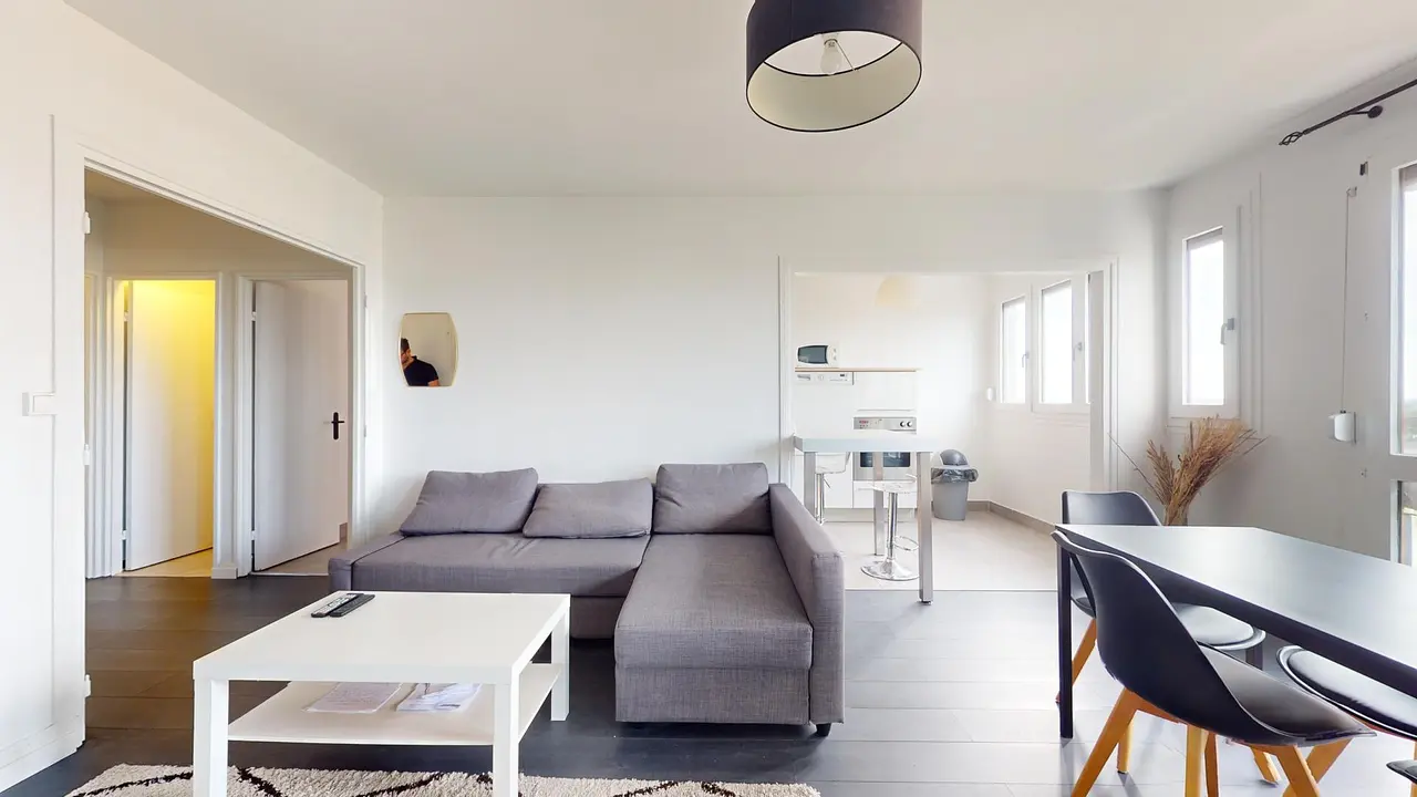 L'appartement s'ouvre sur une entrée avec rangements desservant un lumineux séjour. Celui-ci dispose d'un canapé, d'une table basse, d'un meuble TV avec TV, et d'une table avec 4 chaises.