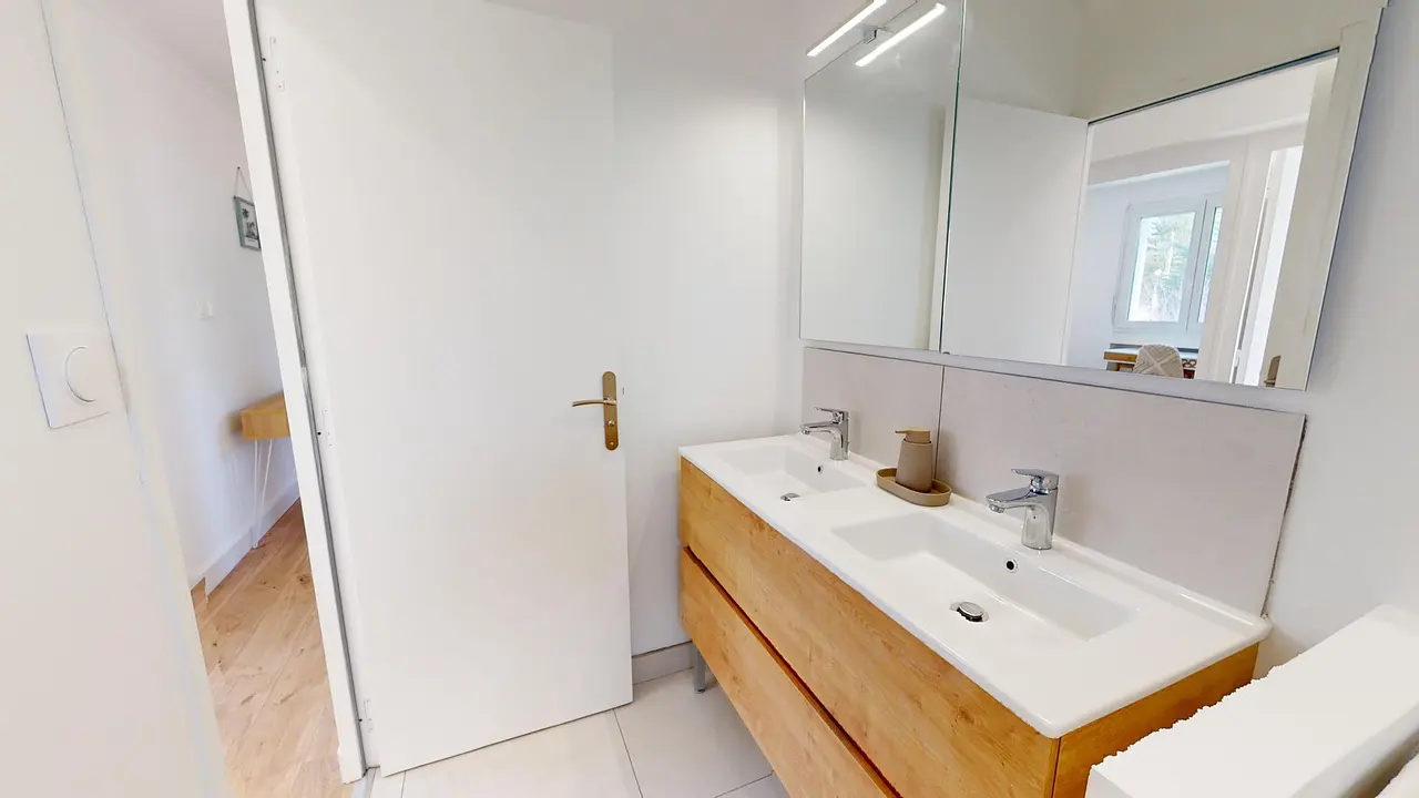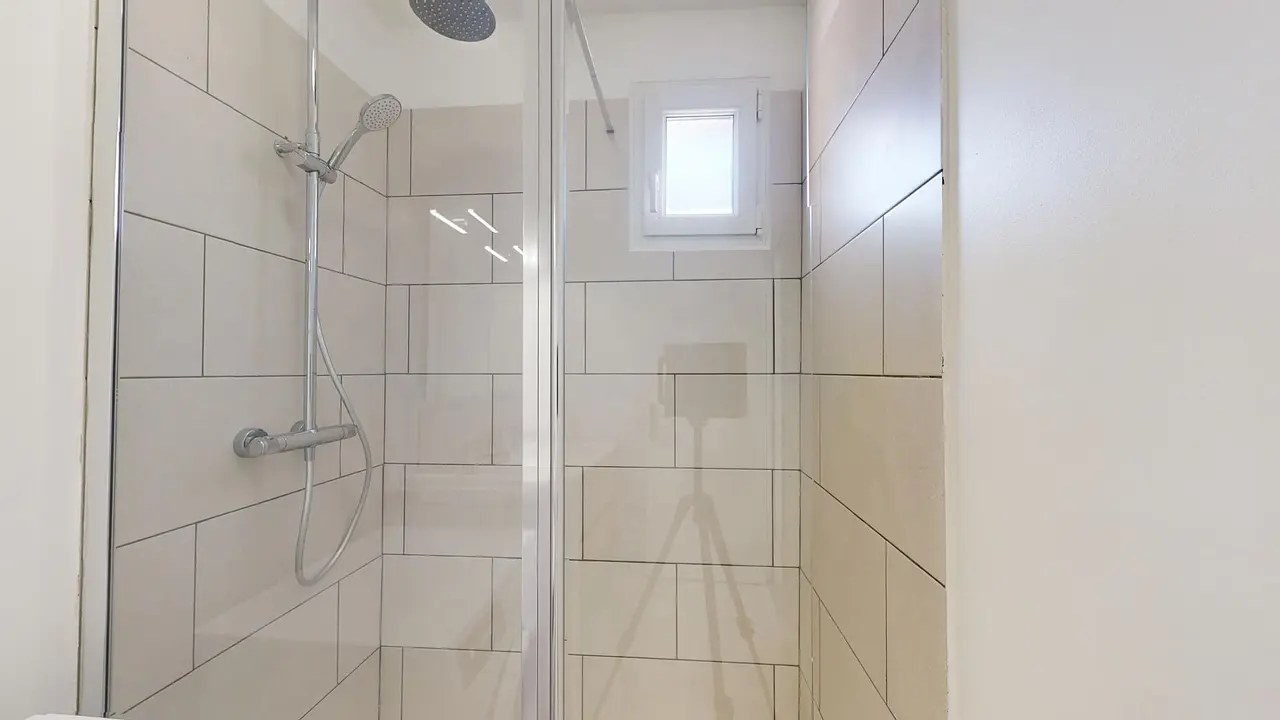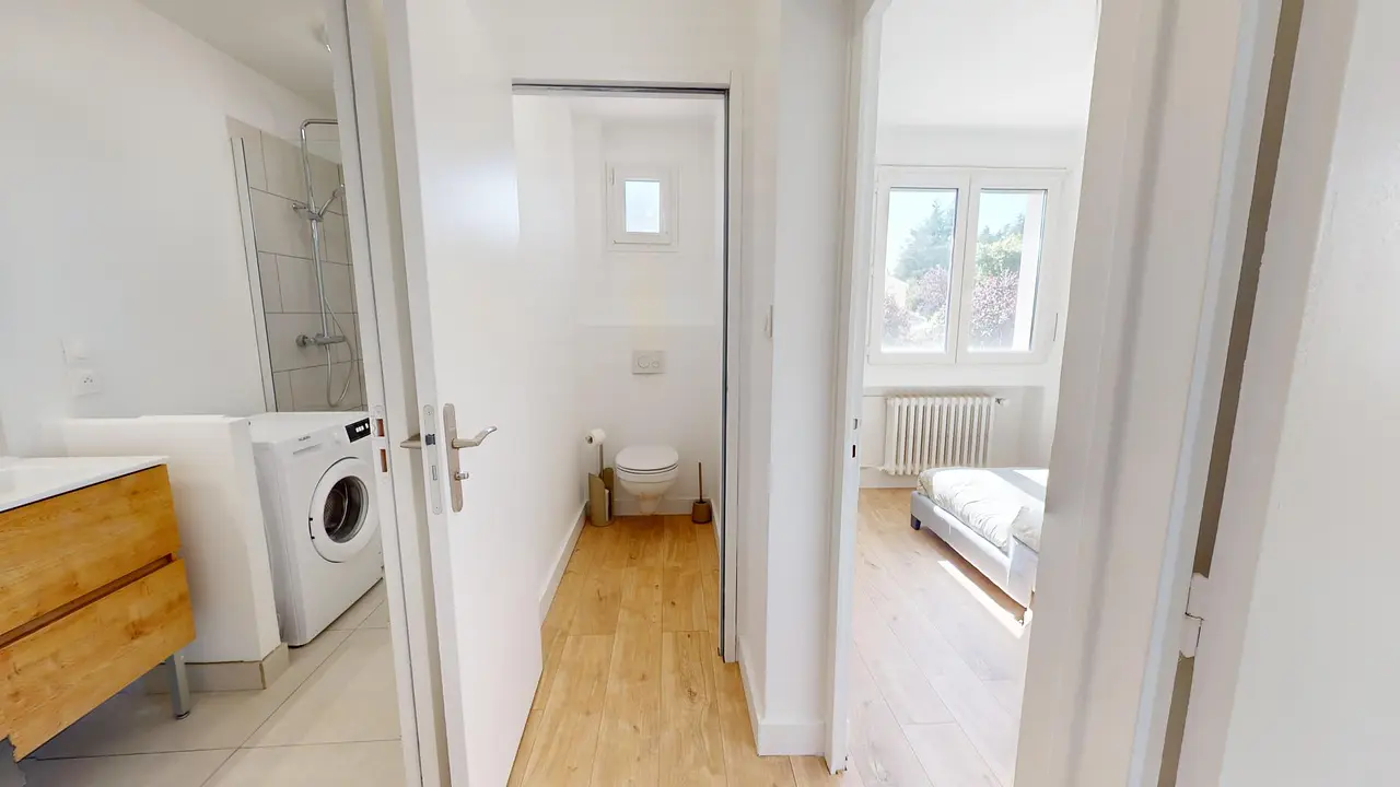 Une salle d'eau moderne complète ce logement, elle est équipée d'une douche, d'un meuble vasque, d'un miroir, d'une machine à laver et de rangements pratiques. Les WC sont séparés de la salle d'eau.