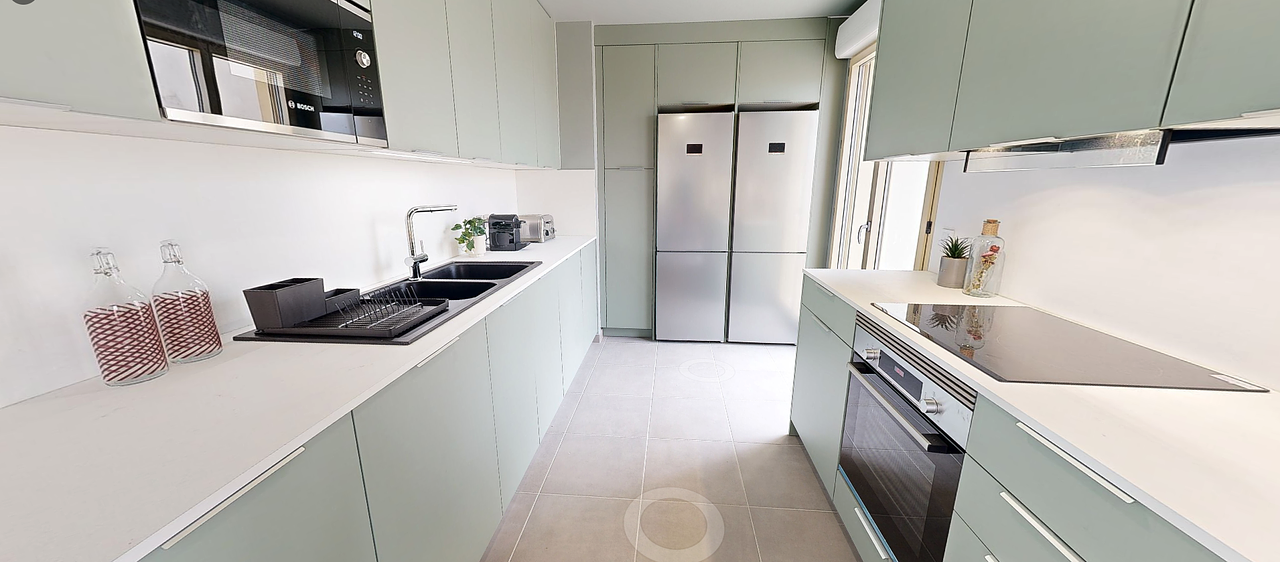La cuisine, ouverte, est équipée de deux fours et deux micro-ondes Bosch, de plaques de cuisson avec hotte, d'un évier, de deux réfrigérateurs avec compartiment congélateur, lave-vaisselle, ainsi que de nombreux rangements et ustensiles de cuisine.