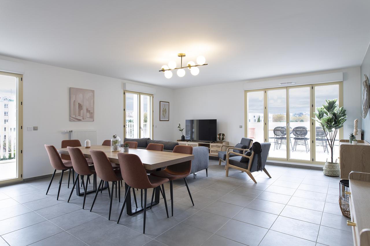 une grande table à manger, canapé et fauteuil, TV et meuble TV, table basse. La terrasse commune de 56m2 est équipée d'une table à manger d'extérieur, 4 transats, et un salon de jardin.