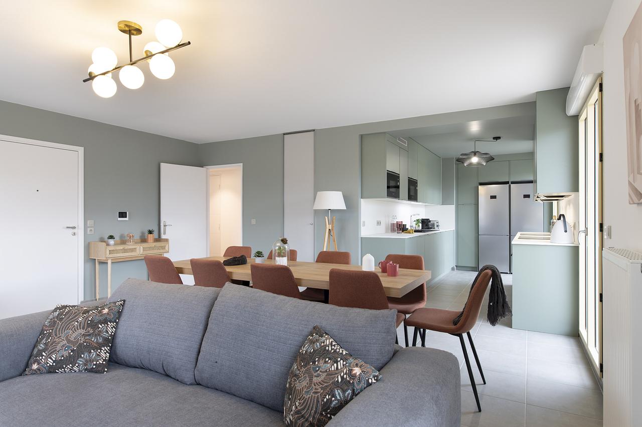 La pièce de vie d'un peu plus de 50m2 est meublée avec