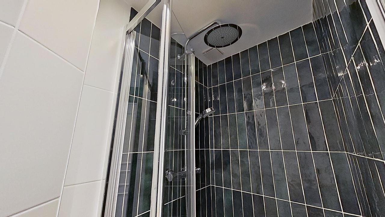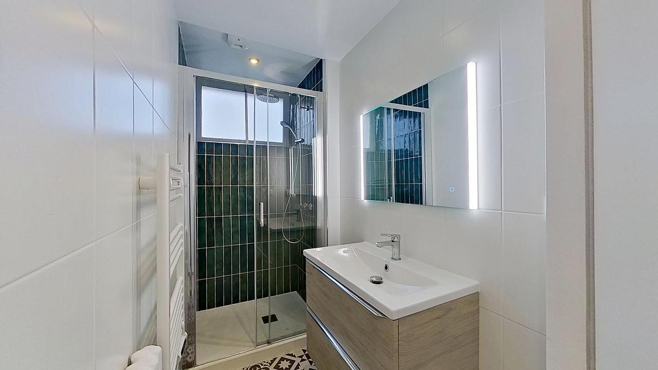 La deuxième salle d'eau comporte une douche, un meuble vasque avec miroir et un sèche-serviette.