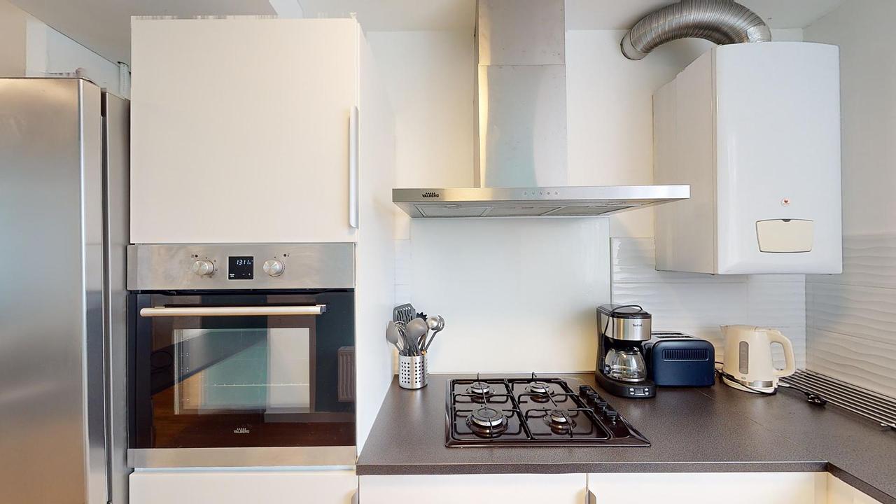 La cuisine est récente et dispose d'un four, d'un réfrigérateur avec congélateur, de plaques de cuisson, d'une hotte, d'un lave-vaisselle, d'un évier, de nombreux rangements et de tous les ustensiles et le petit électroménager nécessaire. Une table servant de plan de travail supplémentaire et d'espace repas complète cet espace.