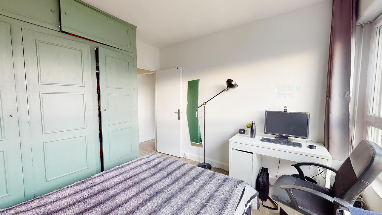 La troisième chambre de cette colocation est meublée par un lit double, un grand placard de rangement ainsi qu'un bureau
