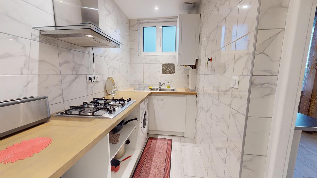 La cuisine attenante est équipée d'un micro-ondes, une machine à café, un grille-pain, des plaques de cuisson avec une hotte, une machine à laver, un double évier ainsi que de nombreux rangements.