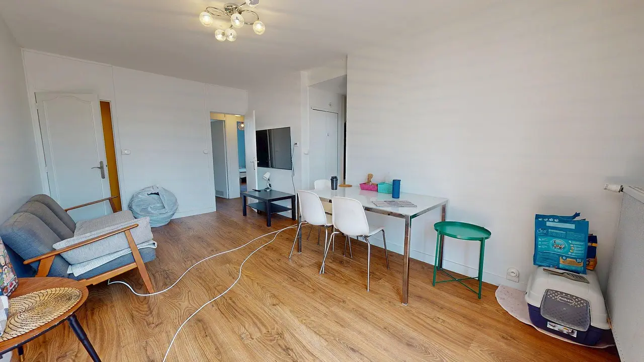 La pièce de vie, lumineuse et agréable, est meublée avec un canapé, une télévision et son meuble TV, ainsi qu'une table à manger idéale pour vos repas et moments conviviaux. Le séjour s’ouvre sur un balcon, parfait pour profiter des beaux jours.