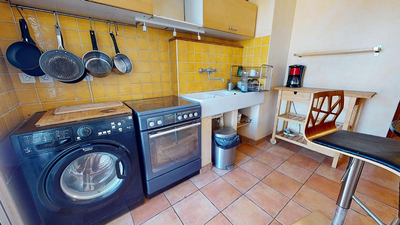 La cuisine quant à elle est séparée et équipée avec une machine à laver, un four, des plaques de cuisson et des rangements. La cuisine offre également un accès à une loggia avec rangements.