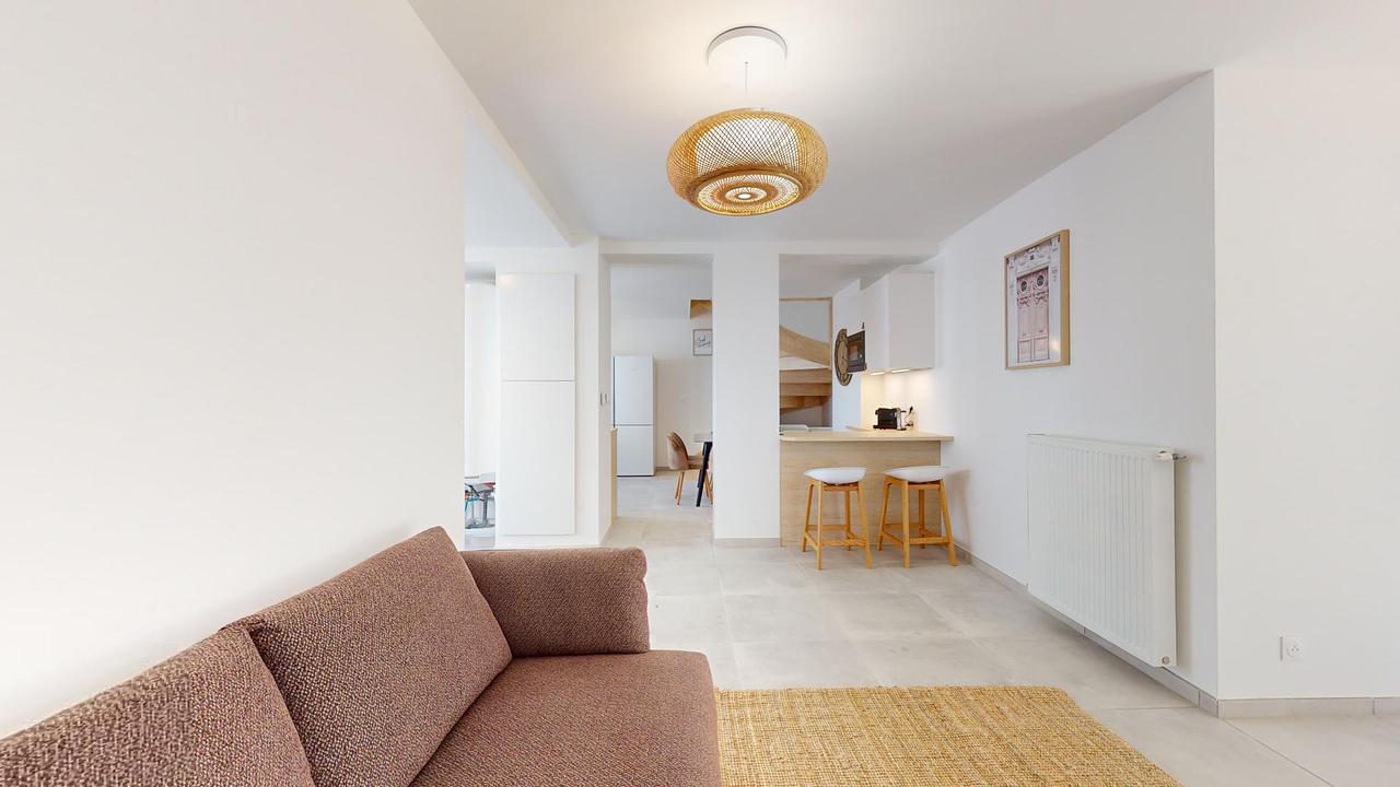 Cette maison s'ouvre sur une entrée avec rangements desservant un spacieux séjour avec cuisine ouverte. Celui-ci comprend un canapé et une TV.