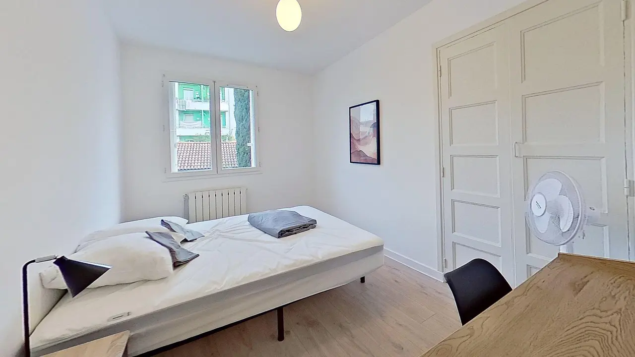 Le logement dispose de trois chambres distinctes, toutes aménagées avec un lit double. Chaque chambre bénéficie de rangements grâce à une commode ou un portant, ainsi que d’un mobilier complémentaire selon la configuration. Les sols en parquet clair et les tons neutres créent une ambiance calme et reposante, propice à l’installation immédiate.