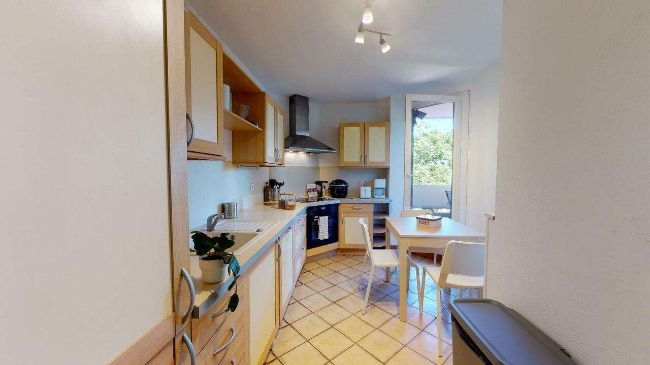 La pièce de vie s'ouvre sur un grand balcon équipé d'une table à manger. Un accès au balcon est aussi possible par la chambre 3 et la cuisine.