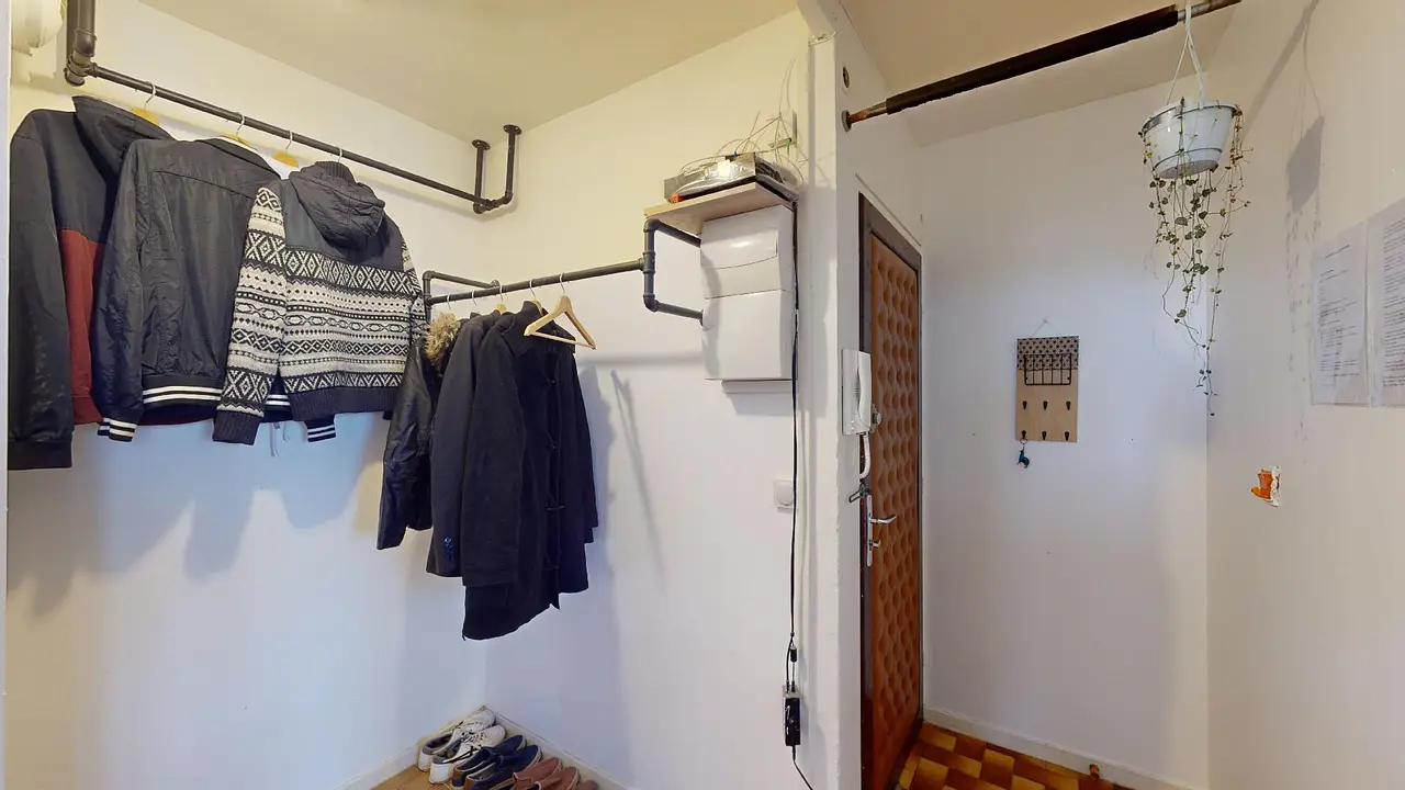 Dès l'entrée, vous avez accès au salon ou à la cuisine, avec un espace dressing pour ranger les manteaux.