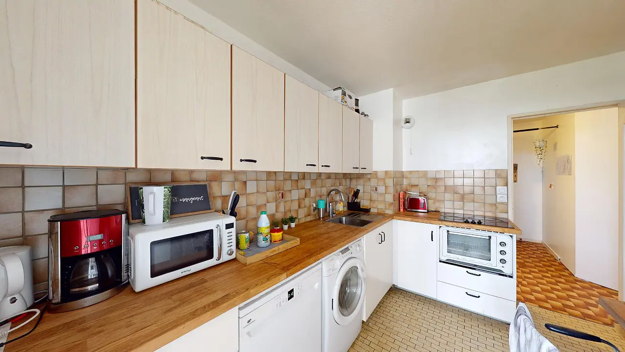 La cuisine est équipée d'un réfrigérateur-congélateur, d'un four, d'un micro-ondes, de plaques de cuisson, d'un lave-vaisselle, d'un lave-linge, d'une table, ainsi que de nombreux placards de rangement. Elle offre également un accès à la loggia.