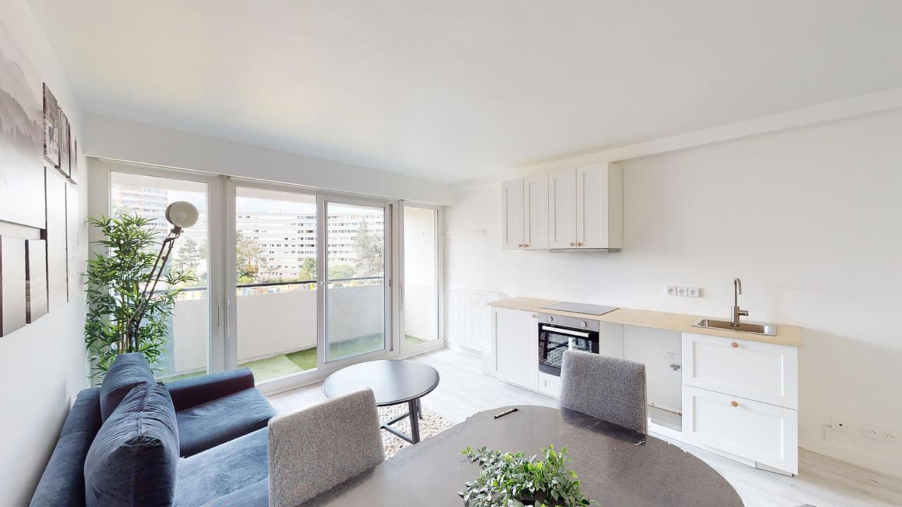 La cuisine est déjà équipée d’un four, de plaques de cuisson, d’une hotte, et de rangement, et s’ouvre un lumineux salon muni d’un canapé, d’une table basse et d’un tapis de sol et d’une table à manger accompagné de quatre chaises. Un charmant balcon avec pelouse synthétique vient compléter ces espaces.
