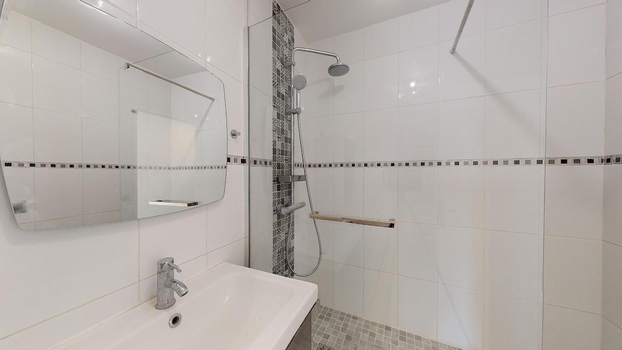 La salle de bain commune dispose d’un meuble vasque et d’une belle douche, ainsi que d’un sèche-serviette.